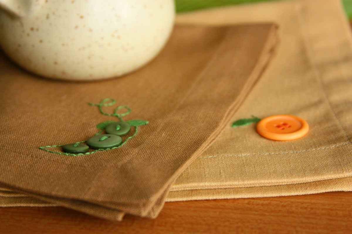 Пришиваем пуговицу, делаем хвостик швом "назад иголка" и листик "гладью" - получаем апельсин. Либо делаем небольшой эскиз на бумаге в виде стручка гороха (предварительно разложив на листе пуговицы для определения размера стручка), и вуа-ля: