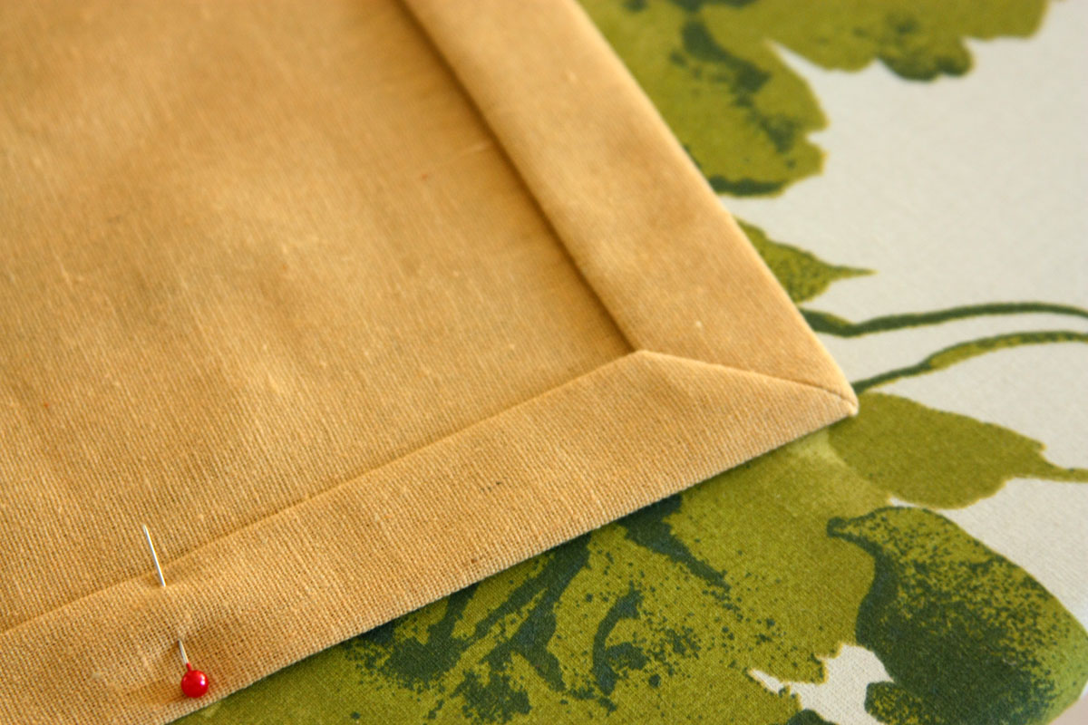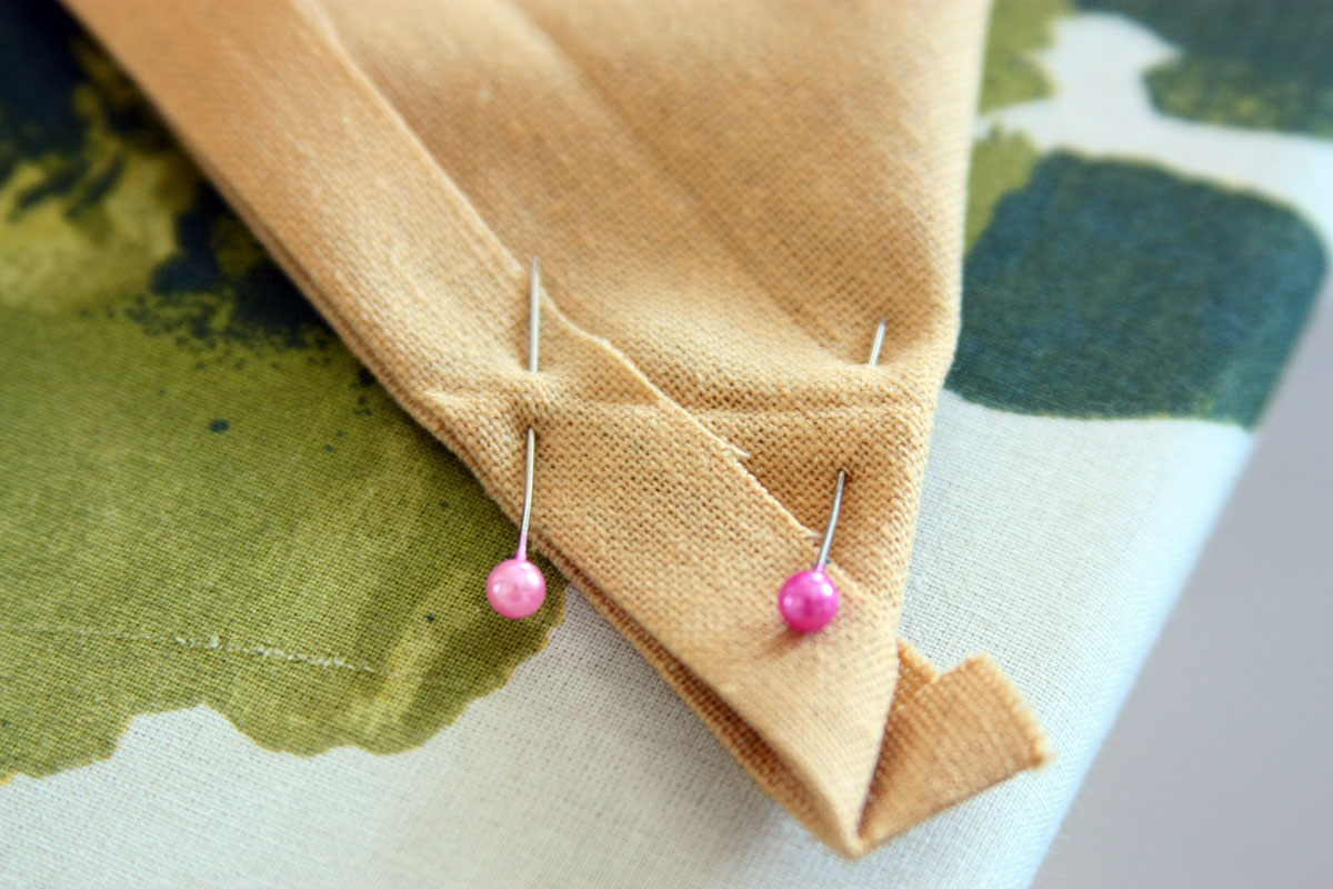 Выворачиваем углы при помощи китайской палочки припуски снова закалываем на изнаночной стороне и прокладываем строчку: