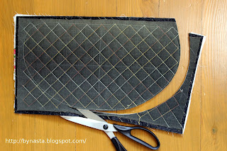 Переднюю часть сначала простегала горизонтально - сверху и снизу от лоскутной полосы, потом вертикально по всей высоте, в конце прошлась по лоскутной полосе такими же зигзагами, как и на клапане. Со спинкой и дном всё понятноКлапан закруглила, используя как шаблон баночку от крема, диаметром где-то 12 см. По периметру всё укрепила строчкой, на расстоянии 5 мм от края.