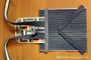 Т.е. это уже сэндвич, в три слоя, как обычно. В качестве наполнителя у меня пропаренный синтепон. Размеры такого сэндвича колеблются в пределах 22-23 см в ширину и 28-29 см в длину. Меньше можно. Больше не желательно, будет немасштабный клапан.
