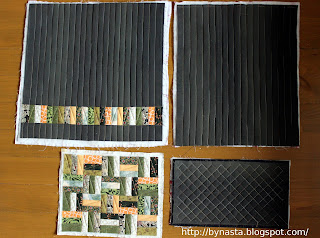 Итак, начинала я с клапана. Для этого нарезала полоски по 3 см шириной - для удобства выбрав целое число :-) Скомбинировала их нехитрым образом, чтобы получились квадраты 6.5х6.5 см или 6.75х6.75 см (с учетом припусков), сшила. Результат: