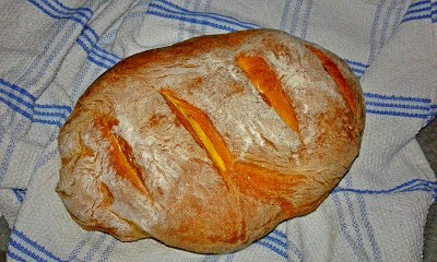 Нагрійте духовку до 180C, посипте хлібину злегка борошном і випікайте 40-50 хвилин. Готовий хліб дістаньте з духовки, накрийте кухонним рушничком (це зробить його особливо м'яким всередині) і дайте трохи вистигнути. Смачного :-)