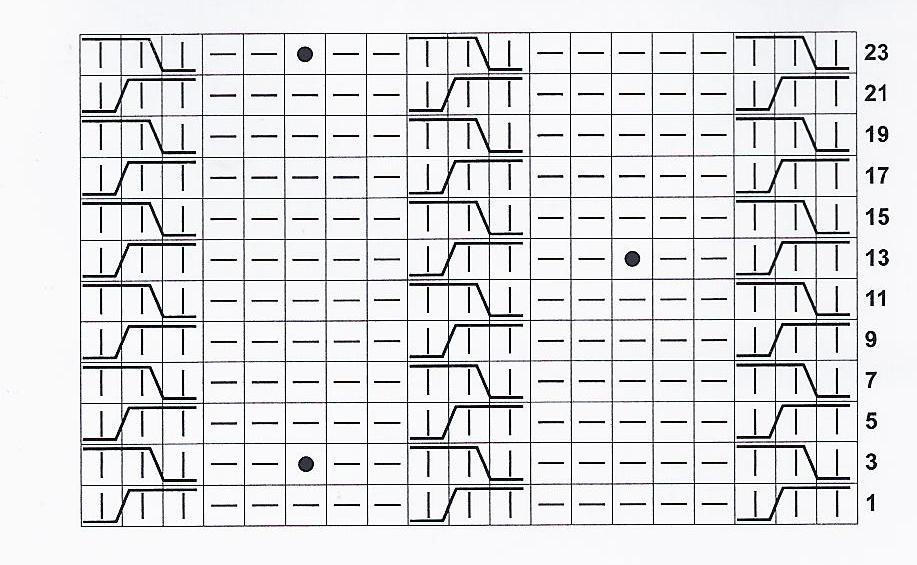 Так вяжите 24 см, потом боковые петли резинки закройте, оставив только петли, связанные по схеме 1 , их провяжите еще 20 см.