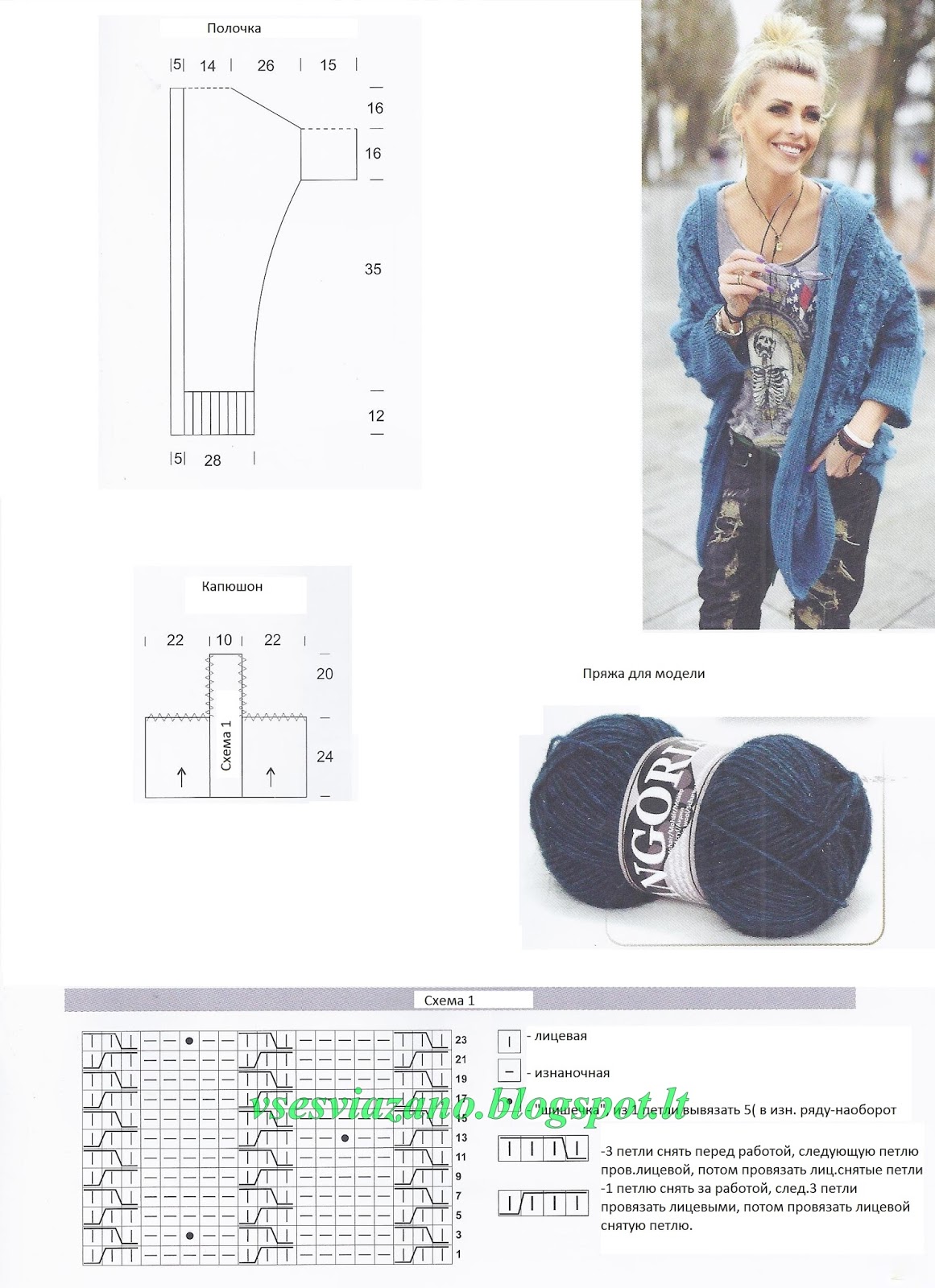 Наберите на спицы петли выреза горловины и вяжите капюшон ( см.его выкройку) по краям -резинкой *1 лицевая, 1 изнаночная*, а среднюю часть (11 петель) - по схеме 1.