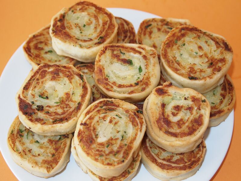 Нужно разложить ее по всему тесту, оставляя тонкую кромку с той стороны, куда будем катить рулет, удобно периодически смачивать руки, чтобы равномерно распределить начинку. Теперь заворачиваем это все рулетиком. Край теста слегка прилепляем пальцами и размещаем рулет так, чтобы этот край оказался внизу. Нарезаем наш рулет.