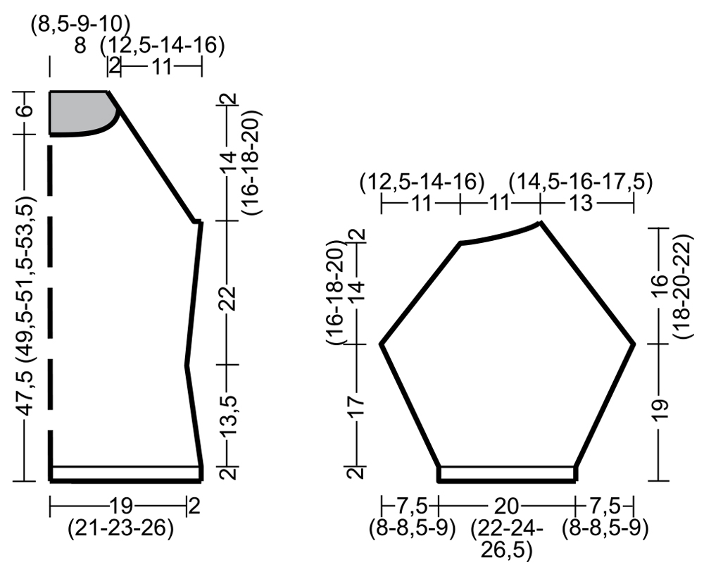 Через 16 (18–20–22) см = 58 (64–72–80) р. от начала регланных скосов закрыть в одном ряду оставшиеся 46 (48–52– 60) петель.