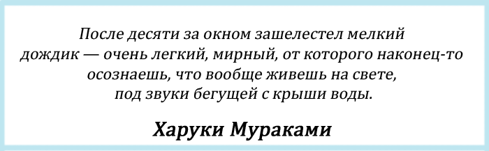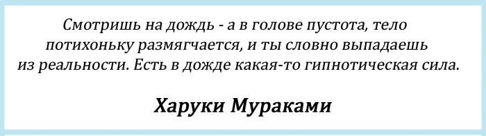 И я стою посреди всего этого, с озорной искринкой в глазах, немножко безумная и безусловно счастливая. Пробегающие мимо люди зябко пригибаются от капель, и недоуменно смотрят на меня, стоящую посреди бушующей стихии. Мне абсолютно все равно что они обо мне думают, главное, что мне это все нравится, а остальное — не важно. Я расставляю руки, желая обнять дождь, и начинаю кружиться в танце — меня ведет дождь...