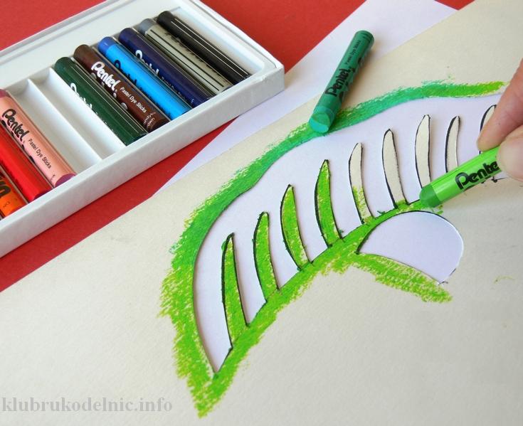 4. Края трафарета густо раскрасим мелком нужного цвета. При раскрашивании под трафарет следует подложить чистый лист бумаги и следить, чтобы следы от мелка не попали на обратную сторону и при перенесении на ткань, не испачкали ее. Раскрашенные трафареты по этой причине нельзя складывать друг на друга.