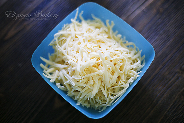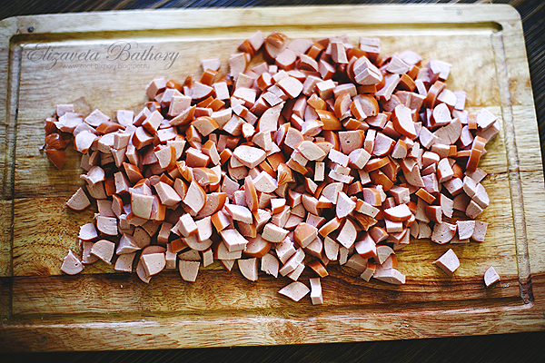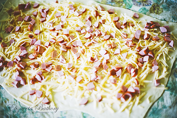 3.Тесто раскатать в тонкий пласт,равномерно распределить по нему сыр и сосиски.