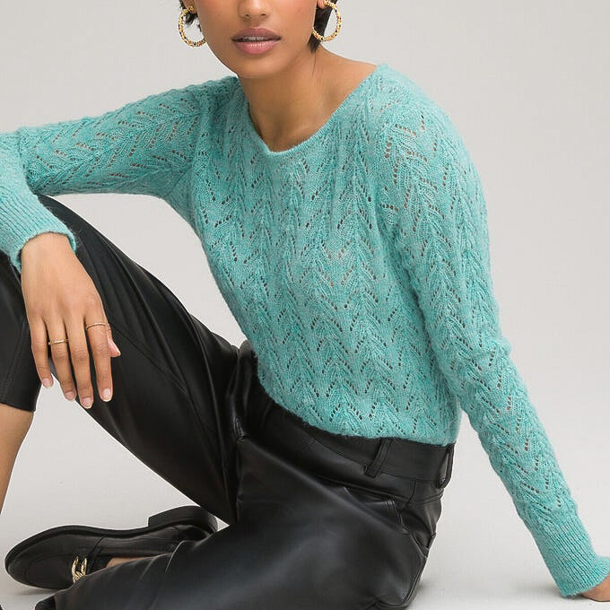 Прямой силуэт, втачные суженые к манжете рукава — классика среди плечевых изделий. Горловина в этой модели немного шире стандартной, но можно вывязать и поуже, вид вещи от этого не сильно пострадает.