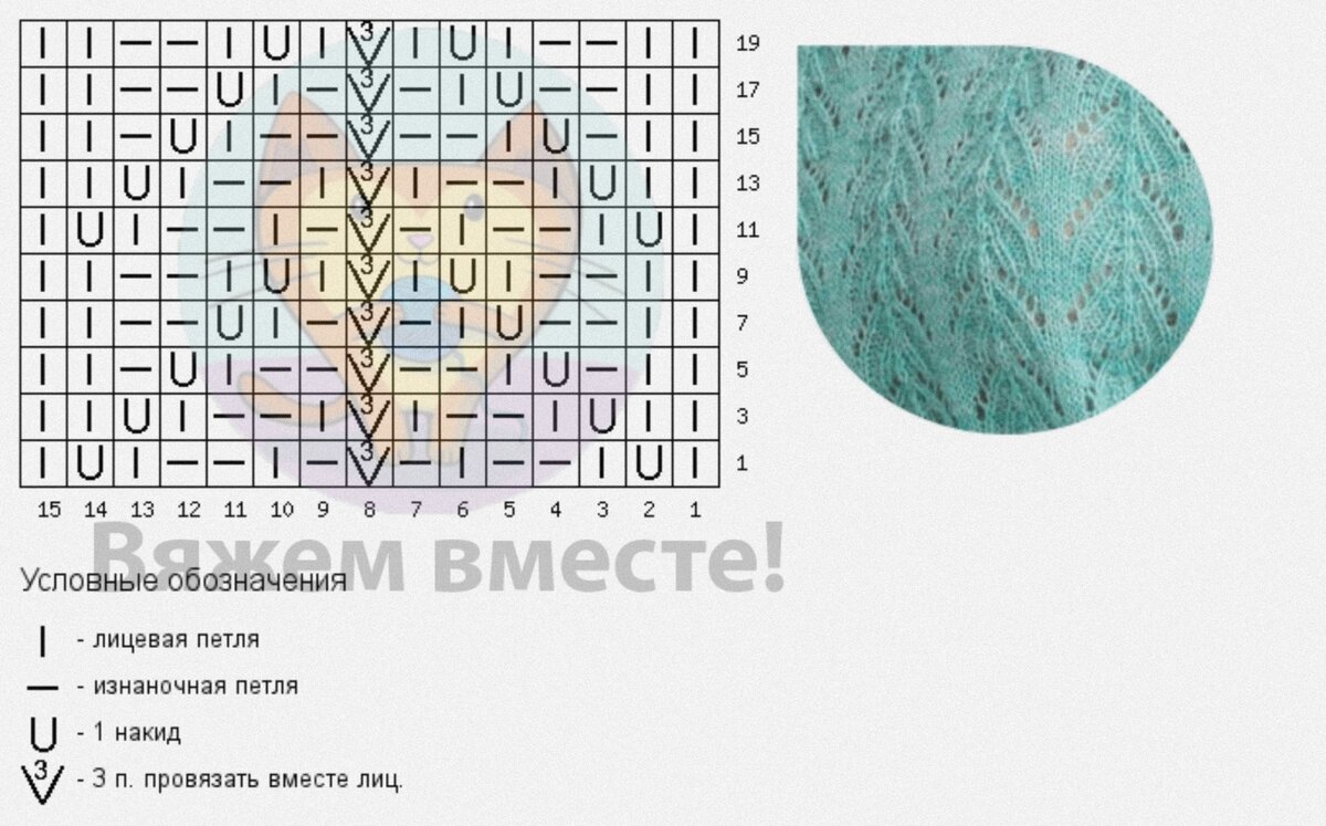 В раппорте ажурного узора используется чередование лицевых и изнаночных петель, вывязывание ажура с симметричными накидами и тройными убавлениями по центральной петле раппорта. Один раппорт = 15 петель и 10 рядов. На схеме обозначены только лицевые ряды, изнаночные вязать так, как лежат петли.