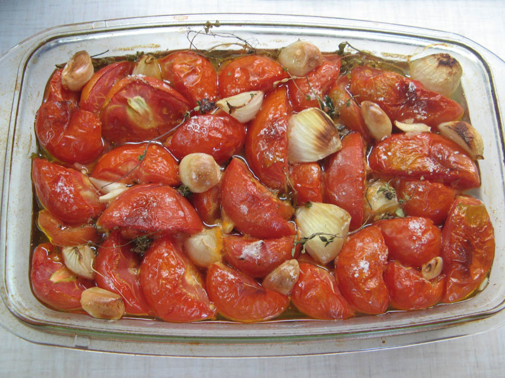 Помидоры разрезать пополам, лук на 4 части, чеснок почистить. Все овощи выложить в форму для запекания, добавить сахар, соль, поперчить, полить оливковым маслом, выложить чабрец и поставить в разогретую до 190гр духовку на 50 мин.