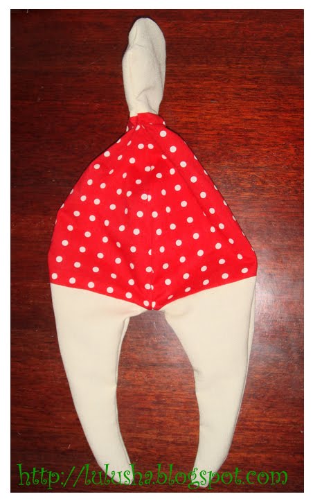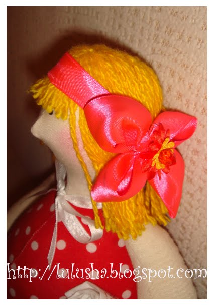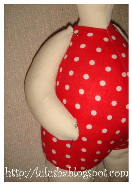 Все детали набиваем холлофайбером. Места набивки зашиваем потайным швом. Как видите, моя куколка сшита не идеально - шов на шее не сошелся... Ну ничего! потом это можно замаскировать.
