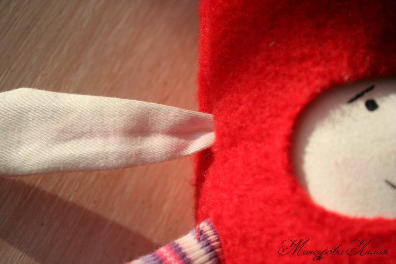Я использовала красный флис.Раскраиваем по выкройке без отверстия для лица,его мы сделаем позже.Оставляем разрезы для ушей и рук.Прошили,одели.Через отверстия вытаскиваем руки и уши.пришиваем бубенчик.Вот теперь аккуратно вырезаем отверстие для лица, кто какое хочет,пошире ,поуже, кому как нравиться.Вырезали.Почистили игрушку двусторонним скотчем от флисовой осыпки и начинаем рисовать лицо.