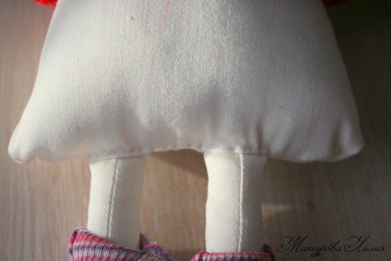 Затем пришиваем ноги к туловищу.Если хотите,чтобы Эльф стоял, необходимо хорошо набить и тело и ноги,и вставить ноги поглубже в туловище.