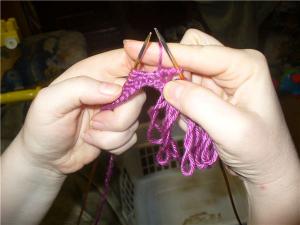 После этого изнаночный ряд старайтесь связать плотно! Затем вяжете примерно 5 или 6 см обычной вязкой (лицевой или изнаночной гладью). После чего опять делаете ряд с бахрамой.