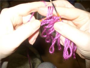 Сначала просунить правую спицу в петлю, затем сделать обмотку на палец и протащить эту обмотку СКВОЗЬ петлю. А дальше точно так же вытянуть бахрому. Все те же этапы только ЧЕРЕЗ петлю протягивается.