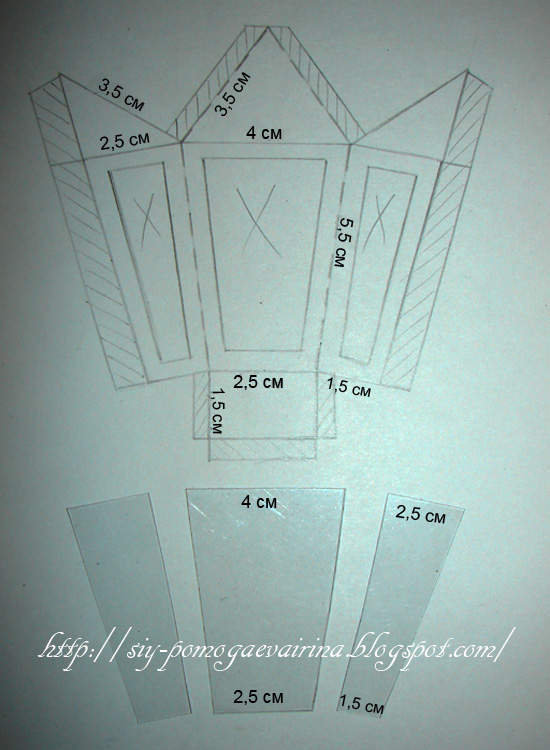 Чертим на белой бумаге чертёж фонарика по размерам. На рисунке места для приклеивания заштрихованы, а там где нужно вырезать-крестики.