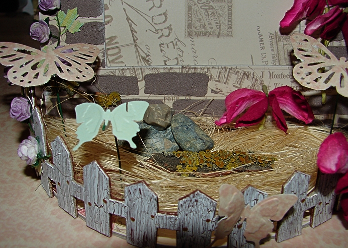 Украшаем цветами, бабочками, вместо травы я постелила сизаль и даже сделала сад камней))