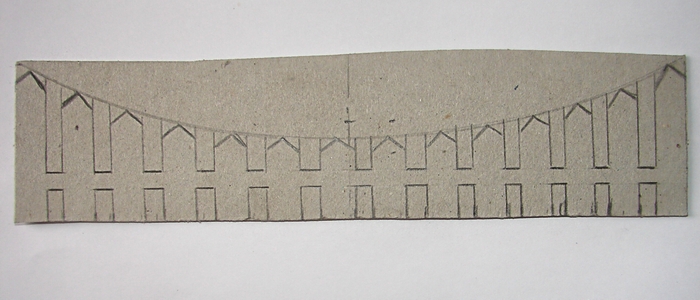 Делаем чертеж. По краям высота заборной доски будет 5 см, по середине 2 см. Вот так.