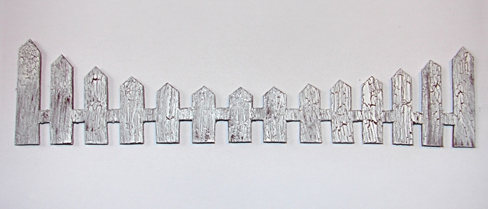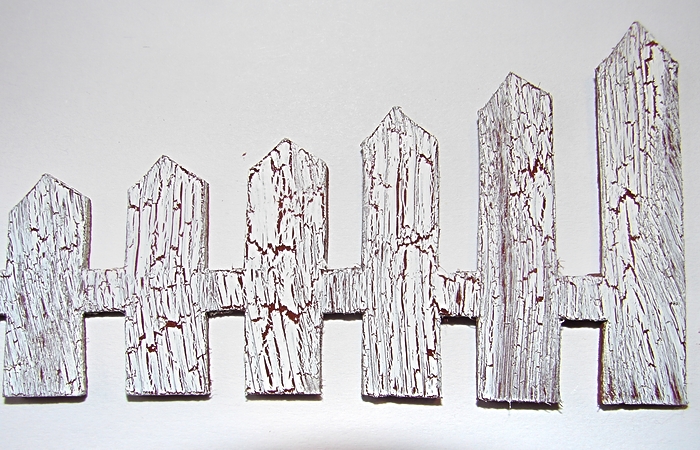После этого, белой акриловой краской (я чуть-чуть разбавляю водой, чтоб не была такая густая) покрываем быстро (одним движением) сверху-вниз наш забор. Я использую для этого губку, а не кисточку. Должно получиться так