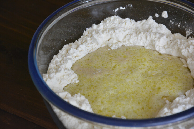 В отдельной емкости смешиваем дрожжи, сахар, соль, оливковое масло и воду. Оставляем на несколько минут, затем выливаем в ямку в муке.