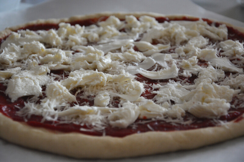 Смазываем тесто соусом, руками рвем треть моцареллы и посыпаем. Посыпаем половиной пармезана.