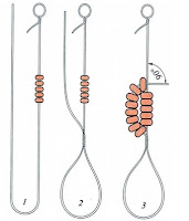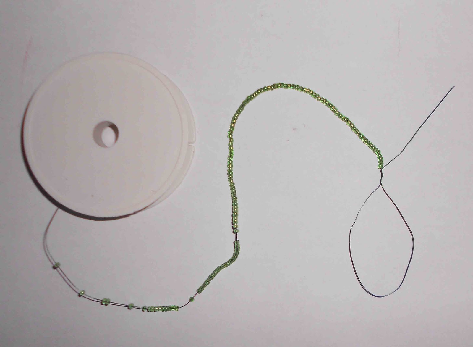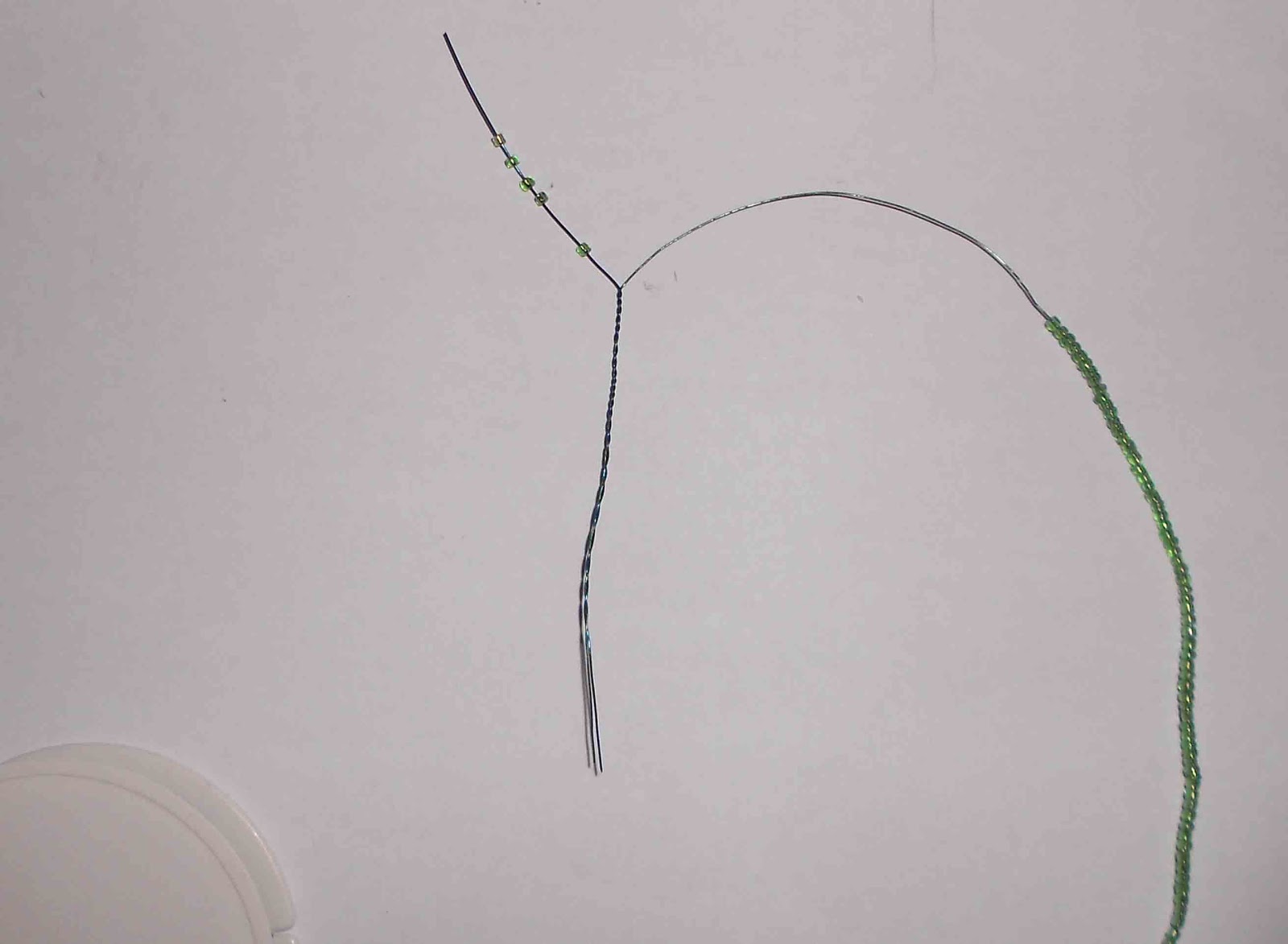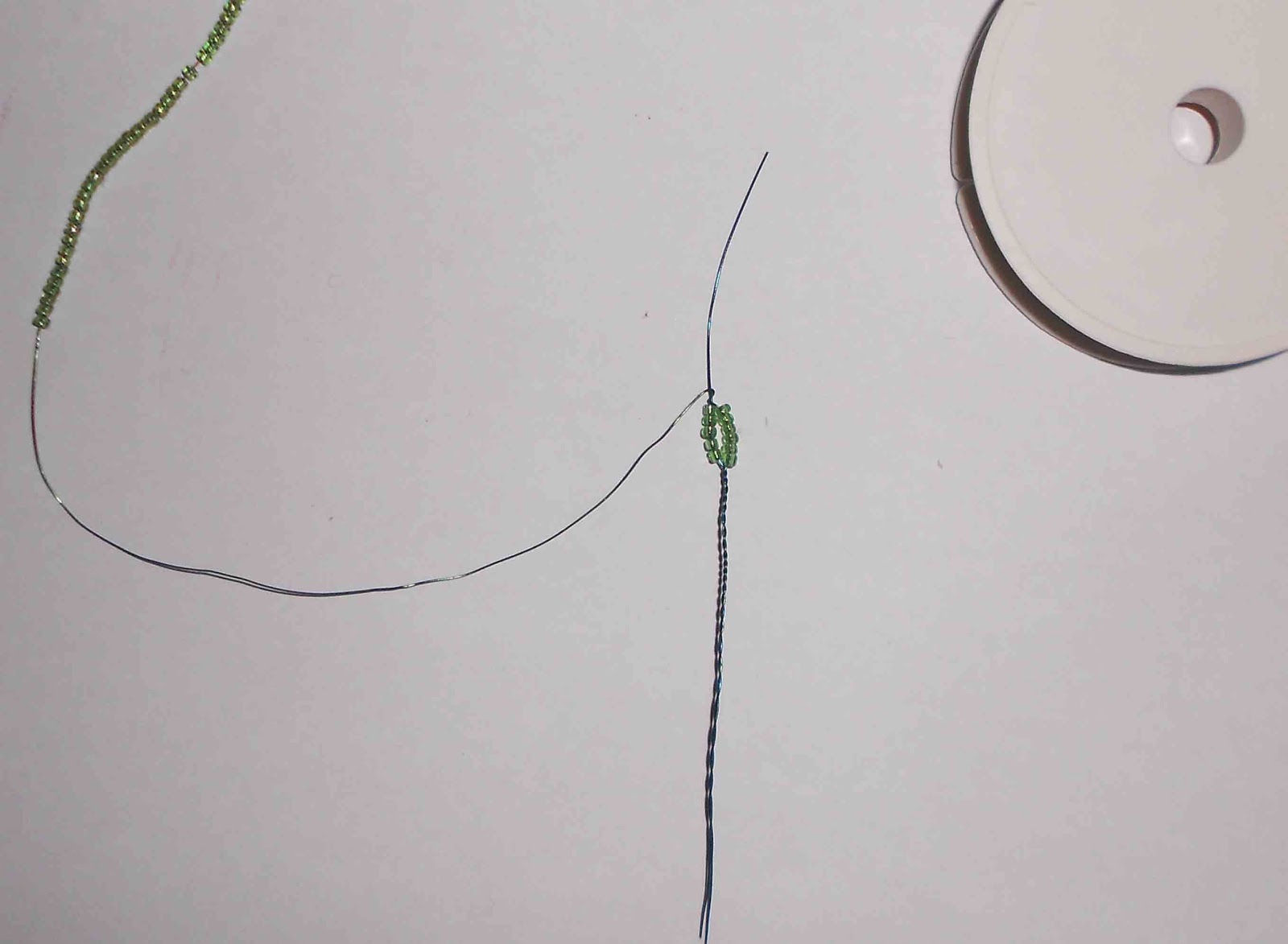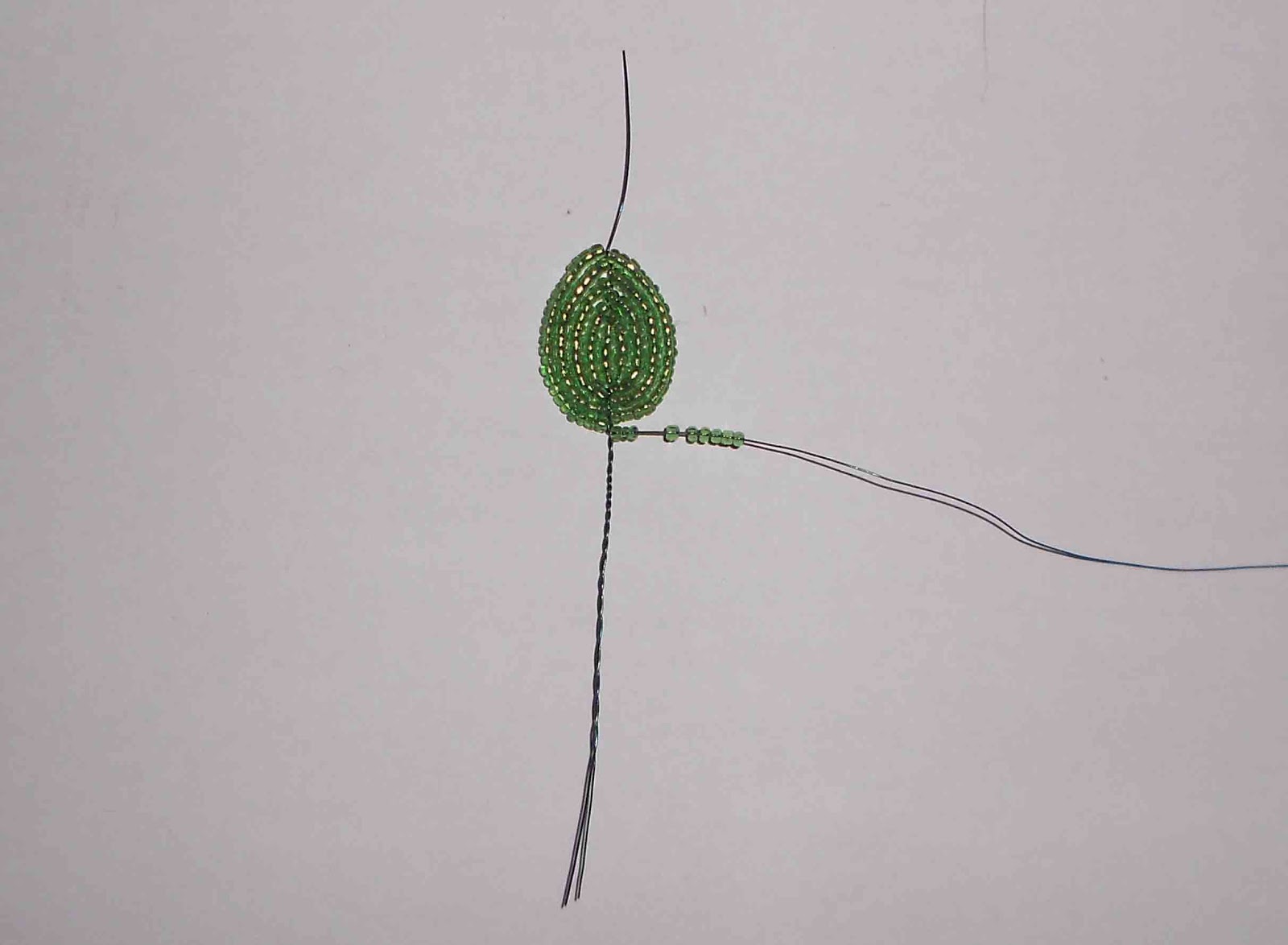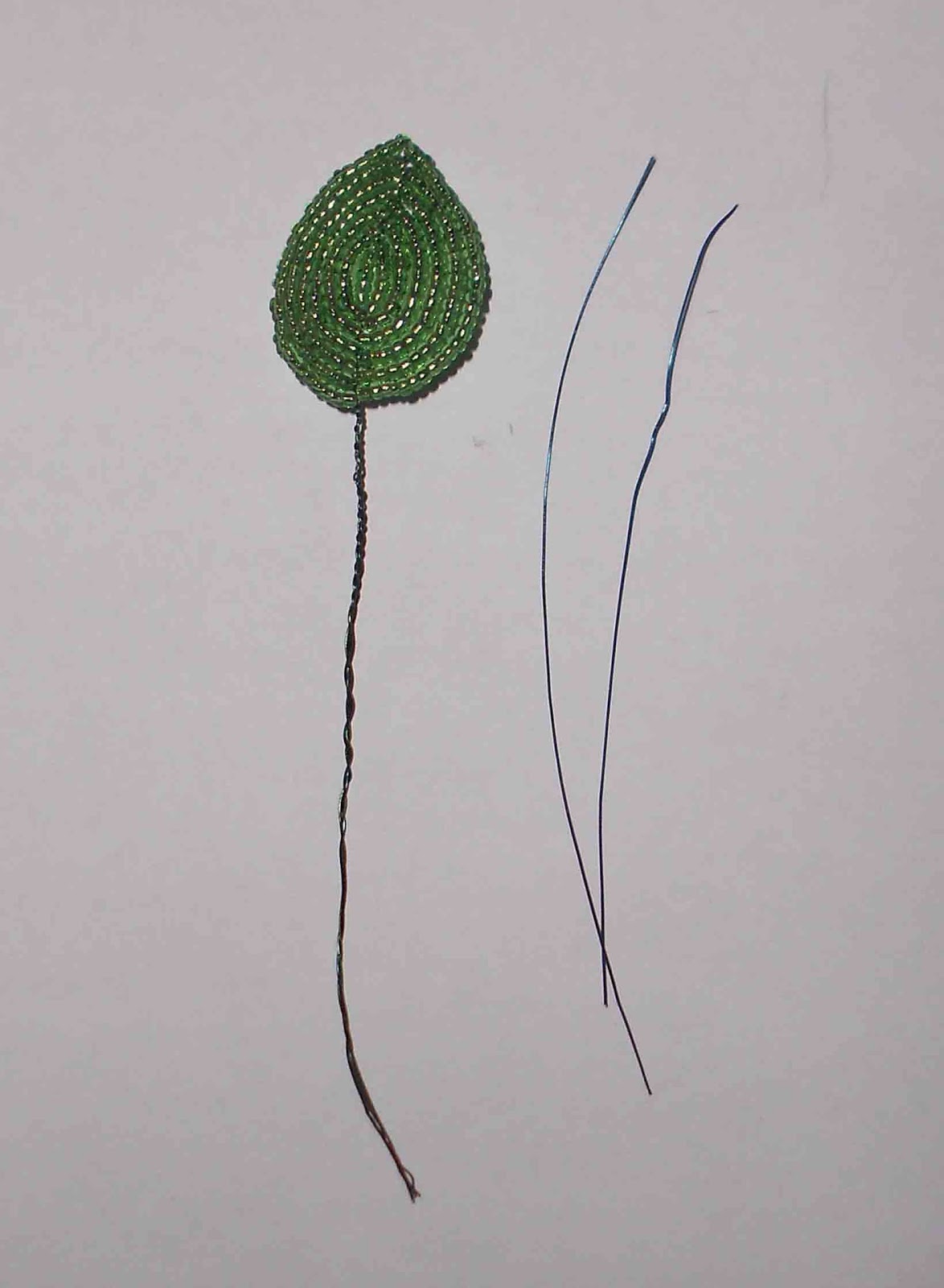 Начинаем плести лист сирени либо как показано на первом фото, либо на втором. Разница лишь в том, что если у вас имеются остатки проволоки,то можно использовать их и соединить остаток проволоки с рабочей и тогда это второе фото. Если же нет, то конец рабочей проволоки складываем таким образом, чтобы образовалась петля (первое фото). Проволоку мы не берем определенной длины, а работаем с мотком проволоки и заранее нанизанным на проволоку бисером, так как сложно рассчитать сколько потребуется проволоки и бисера на один элемент (в данном случае - лист). Нажимайте на фото, они увеличатся и каждая деталь будет вам видна.