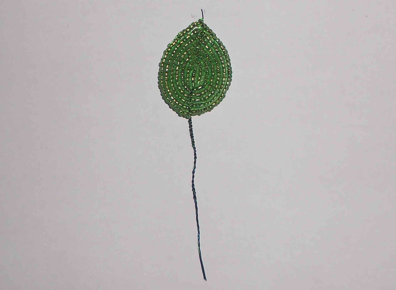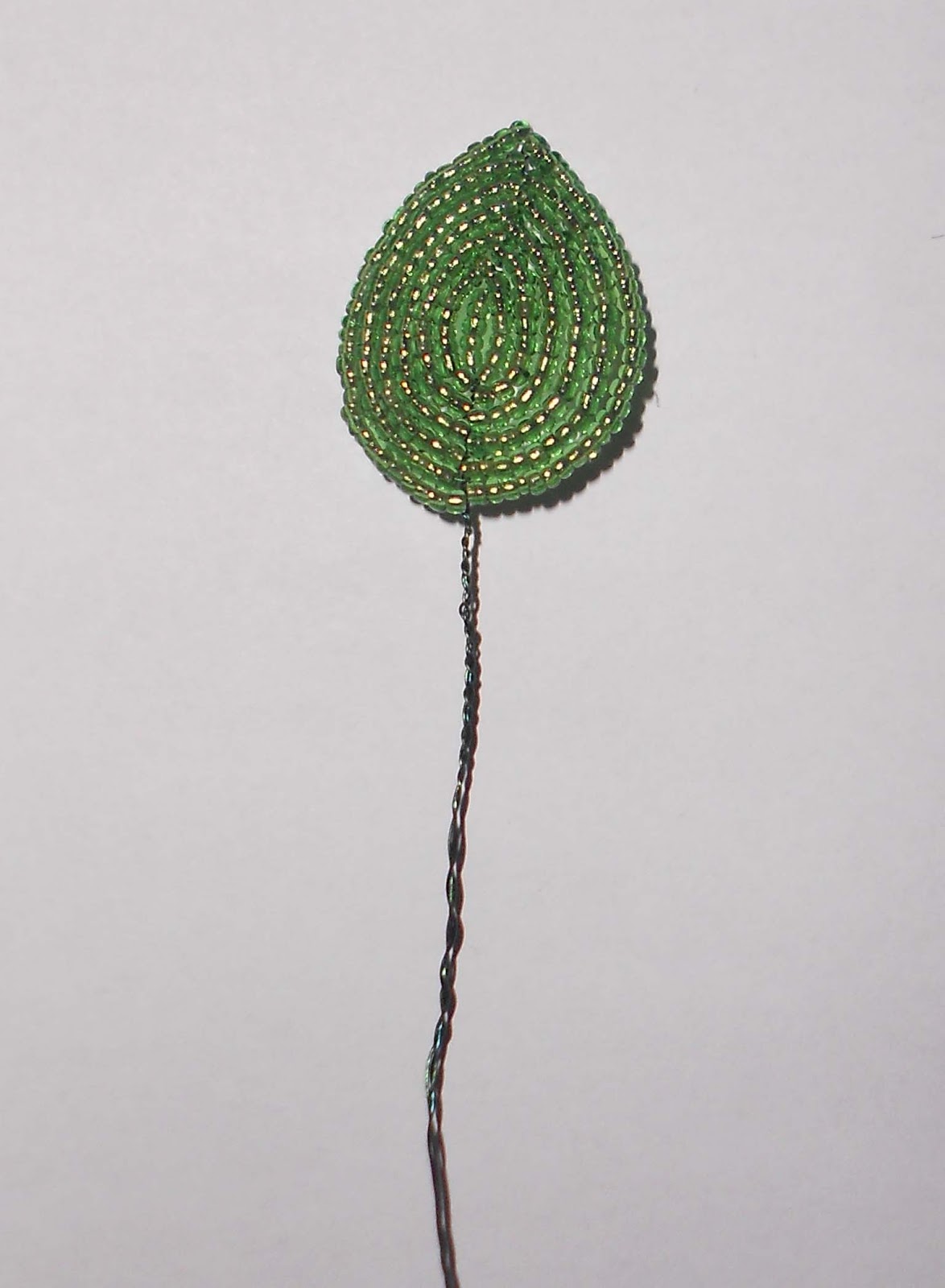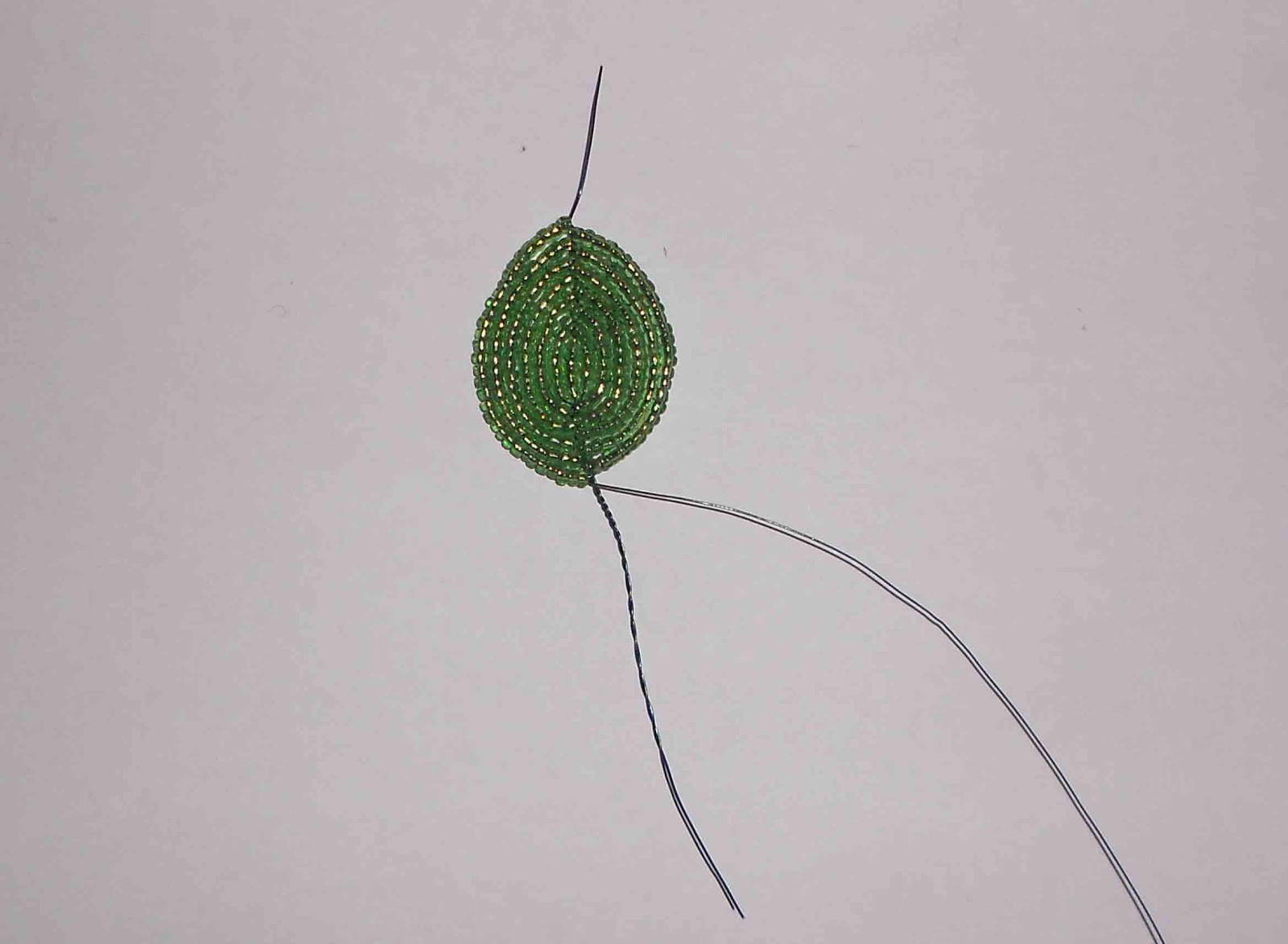 Оставшийся кусочек проволоки подрезаем до 3-4 мм, и загибаем его во внутреннюю сторону листа. Можно его не отрезать, я попробовать продеть в соседние бисеринки и только потом отрезать, тогда видно его не будет совсем даже с внутренней стороны листа.