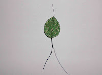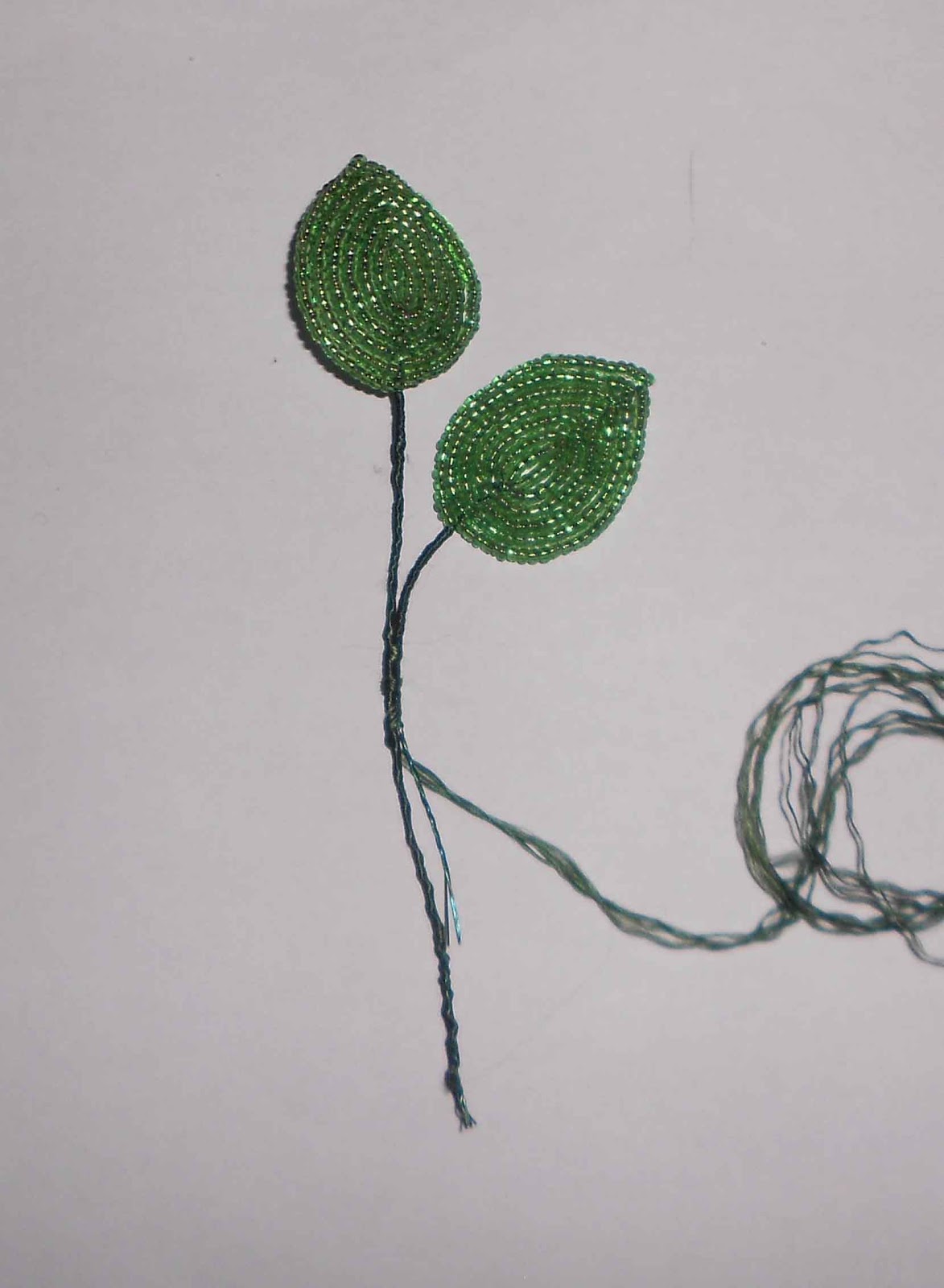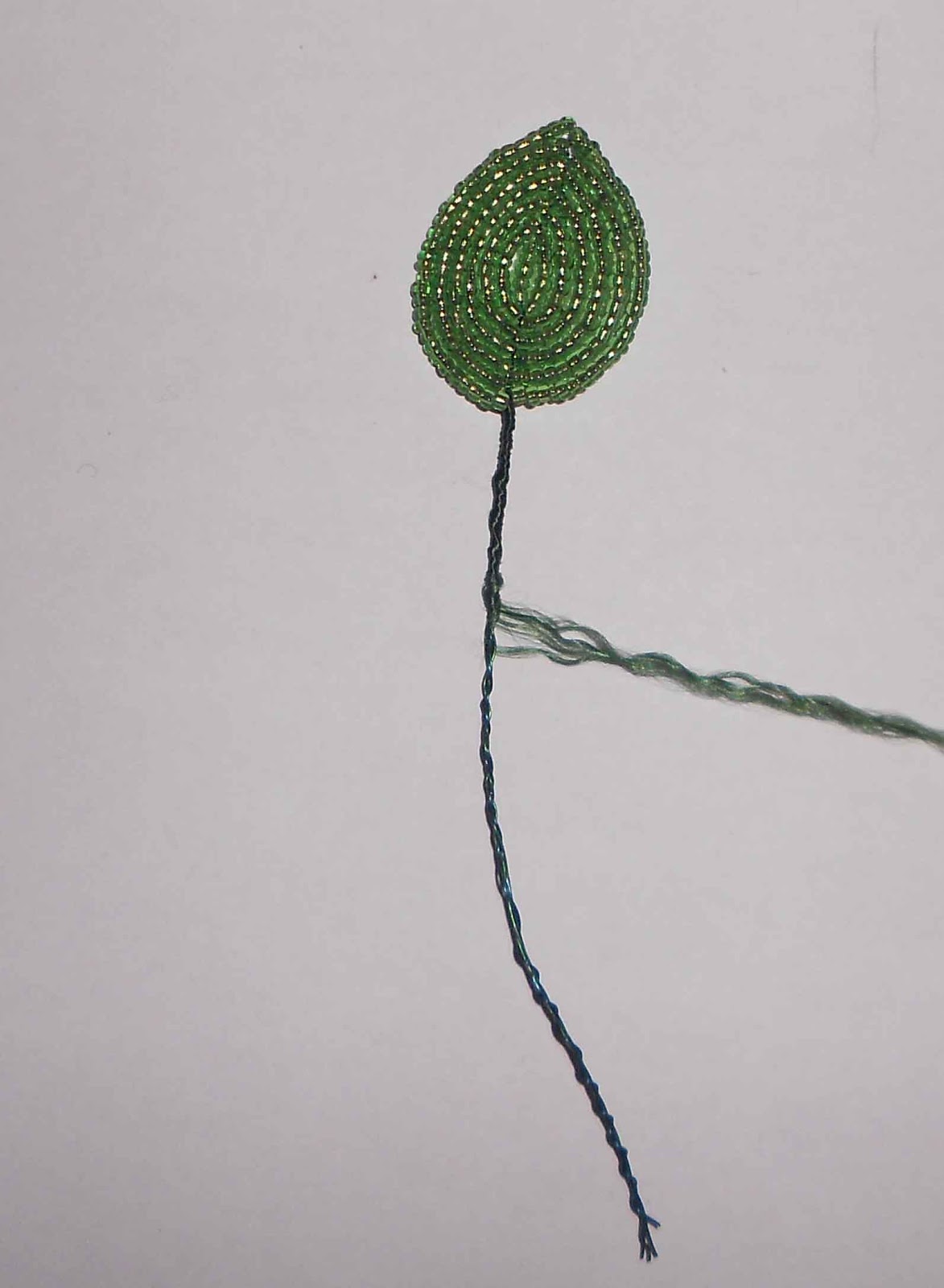 Утолщаем немного ножку листа, чтобы он не висел, так сказать. Для этого, к готовому листу приплетаем дополнительно одну или две проволочки. И обматываем нитками мулине.