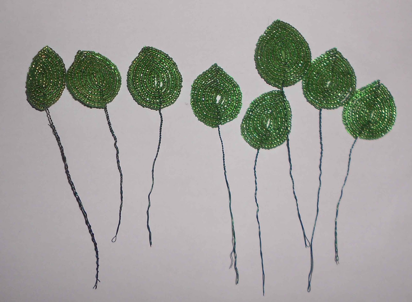 У нас лист остроконечный сверху и округлый внизу. Плетем 5-6-7 дуг с одной стороны для одного листа так, чтобы они плотно прилегали одна к другой. Так как листочки не могут быть все одного размера, поэтому и количество дуг разное.