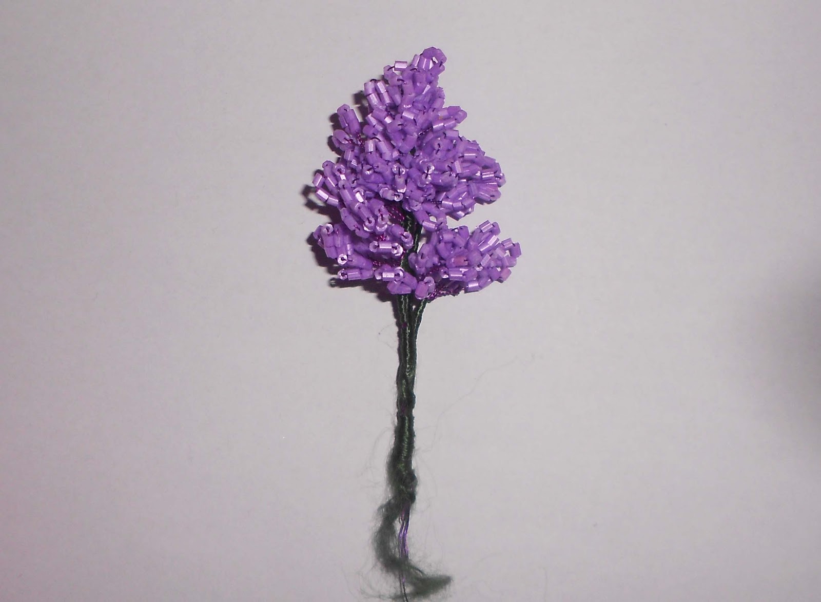 Соединяем все эти детали нитками мулине в единое целое - ветку сирени. Бамбуковая палочка у меня в основе ветки, вместо нее можно использовать толстую проволоку. Что получилось у меня - перед вами.