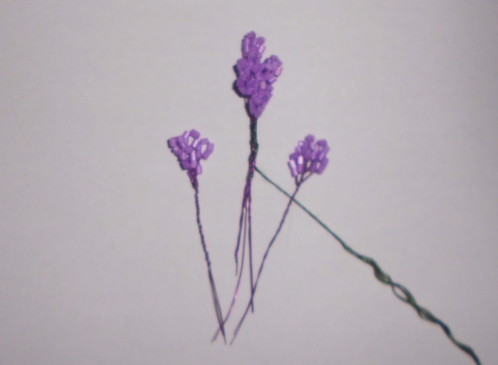 Начинаем плести цветки сирени, как уже было сказано, петельной техникой плетения, которую я подробно описала. У меня рубка матовая сиреневого цвета, и проволока в цвет рубки. Плетем вот такие веточки на проволоке длиной примерно в 20-30 см. Если петель 5, то хватит длины в 20 см, а если 6 или 7, то в 25-30 см. На одну петлю - 5 бисеринок. Веточки с цветками делаем в 5, 6 и 7 петель для того, чтобы сирень не выглядела однобокой.