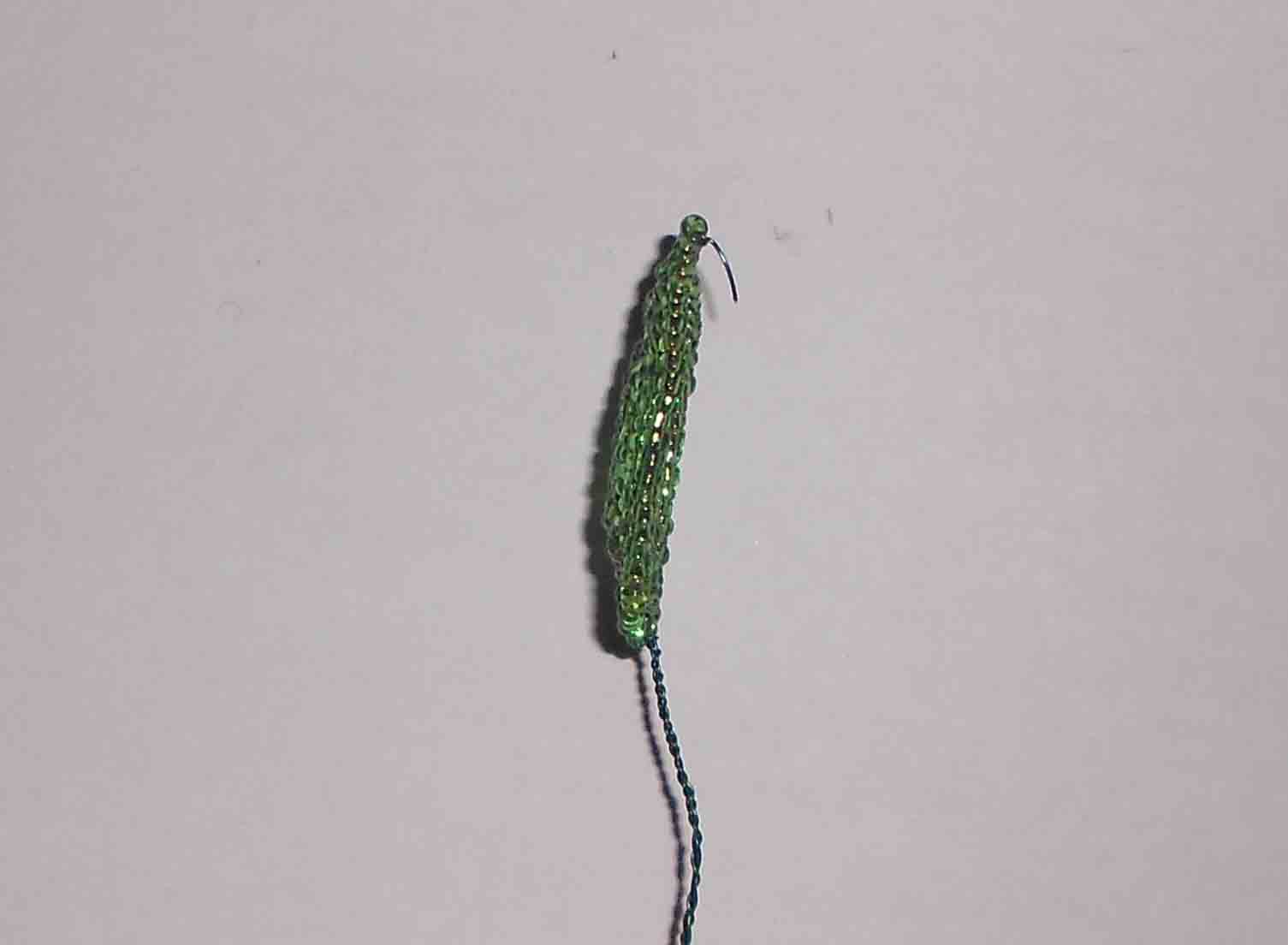Первая дуга будет состоять на 1-2 бисеринки больше, чем было нанизано на кончик, т.е это 6-7 бисеринок. Делаем один оборот вокруг проволоки, и далее идет вторая дуга, также состоящая на 1-2 бисеринки больше, чем предыдущая.