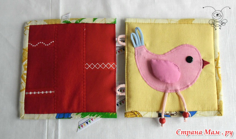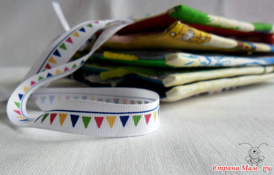 Петельки сделаны из разноцветных шнурочков. На репсовой ленте, скрепляющей странички, изображены флажки четырех основных цветов.
