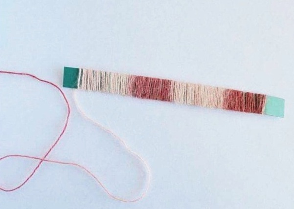 Возьмите полоску картона и завяжите на ней кончик мохеровой нити.