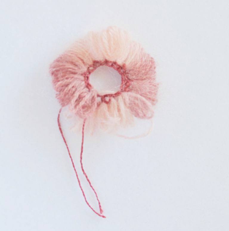 Таким образом делаем три "кружка". Все кончики обрезанных нитей нужно аккуратно замаскировать. Теперь очень аккуратно отпарьте края, связанные "Ирисом"! Это придаст лепесткам красивую форму, края станут выглядеть очень красиво и ровненько. Не нужно отпаривать мохер, цветок должен быть пушистым :-)