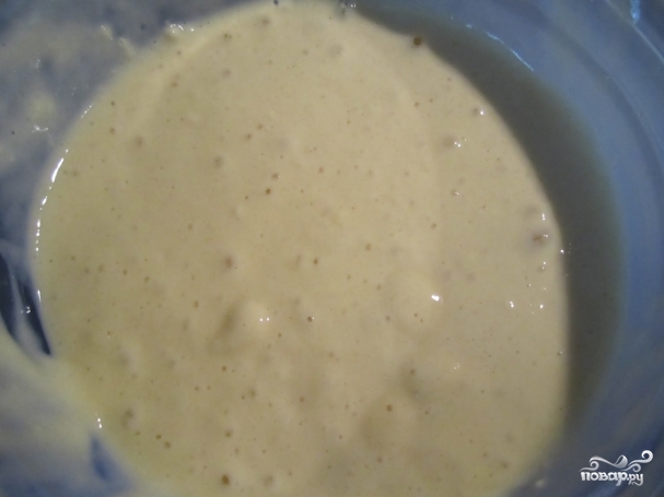 Яйцо взбить с сахаром, добавить соль, постепенно добавлять кефир и муку, пока не кончится кефир — должна получится консистенция сметаны. В конце добавить соду и дать постоять, должны сформироваться маленькие пузырики.