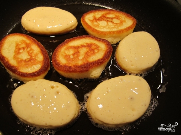 Ложкой или половником налить оладьи на разогретую и смазанную сковороду. Обжариваем с каждой стороны.
