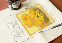 5. На различные виды грибов можно сшить несколько мешочков . Картинки объединим одинаковой надписью и одинаковыми рамочками у приклеенных картинок. Кисточкой, намоченной в текстильную краску, нарисуем, например, волнистую рамочку. Примерно через час сушки приклеенной картинки и текстильных красок зафиксируем все горячим утюгом. Гладим в течение 3-5 минут утюгом, наставленным на хлопок, с задней части ткани или с передней стороны через бумагу для печения.