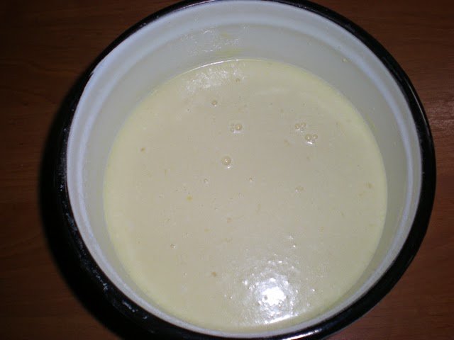 Яичные желтки взбить с остальным сахаром и ванильным сахаром добела, добавить крахмал и размешать до однородного состояния.