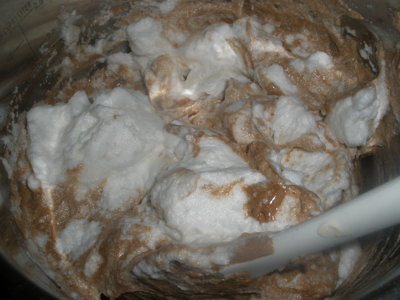 5. Добавить белковую массу к шоколадно-желтковой. Ее вводим частями, аккуратно размешивая лопаточкой. Все белки должны разойтись.
