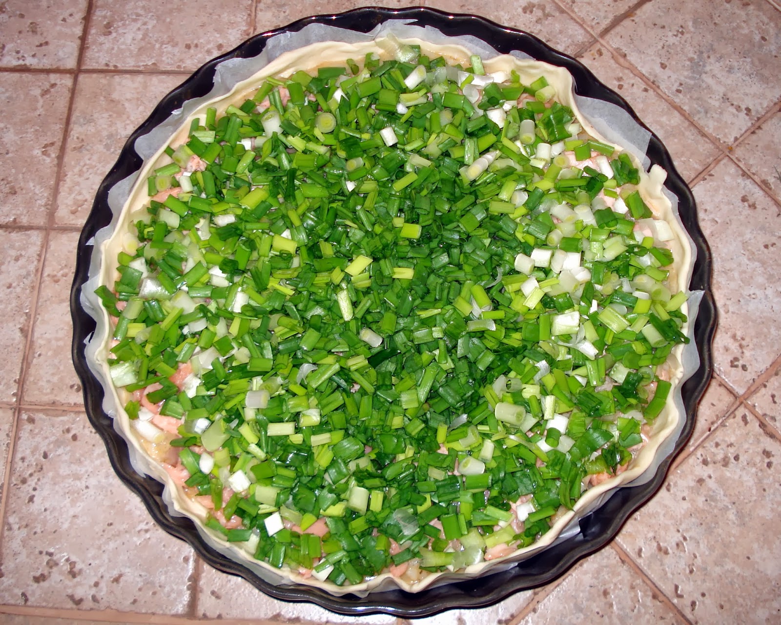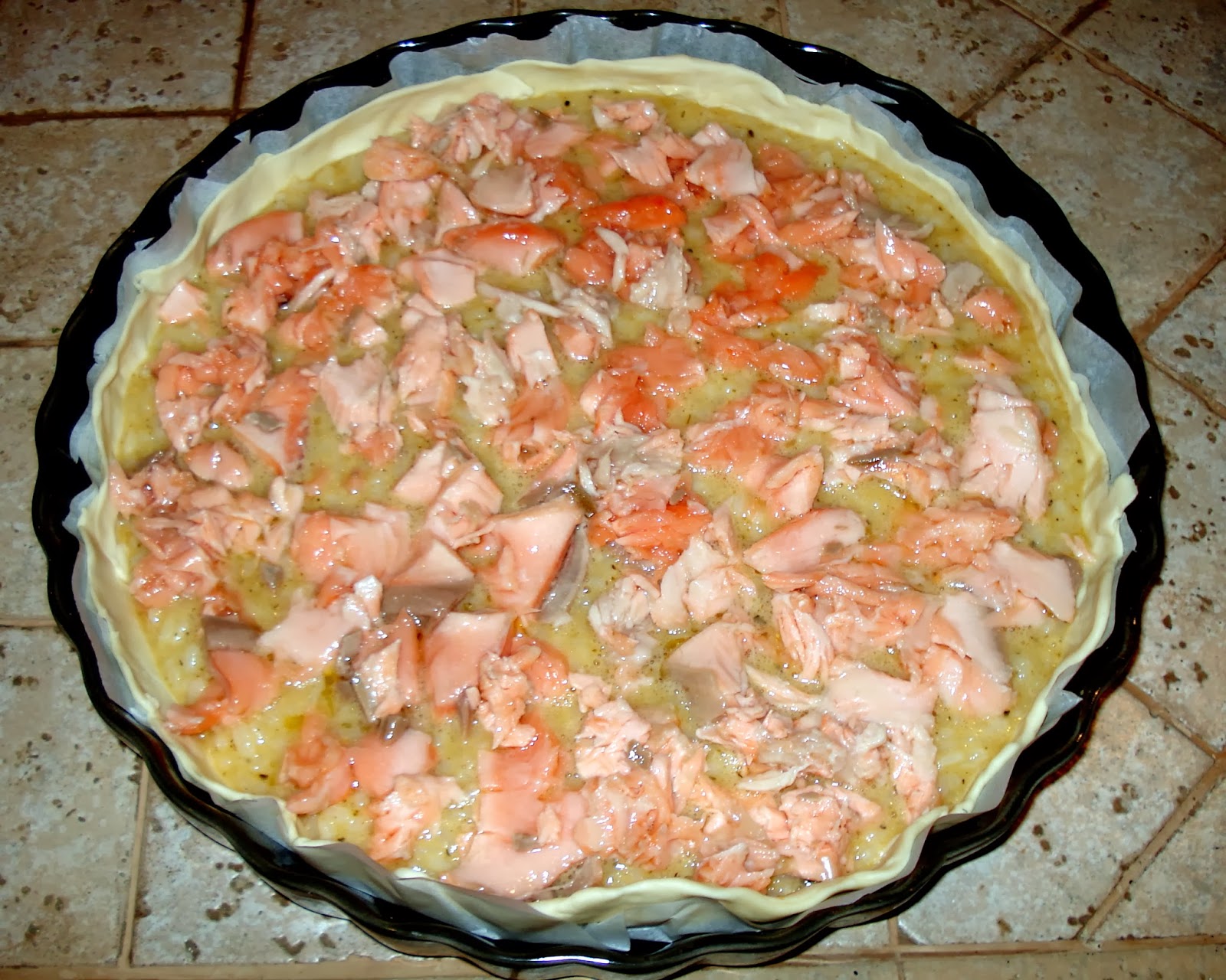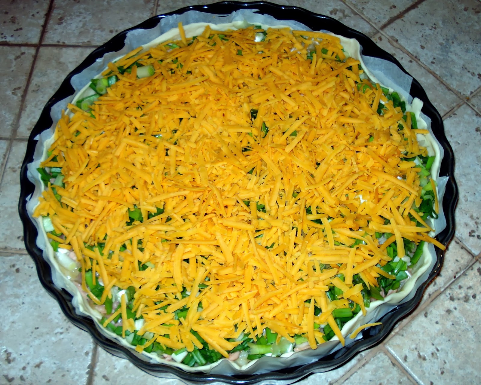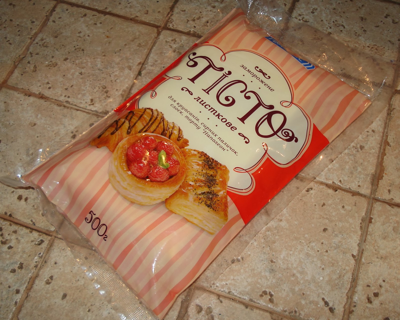 7. Раскатать 1/2 порции слоеного теста и уложить его на дно формы.