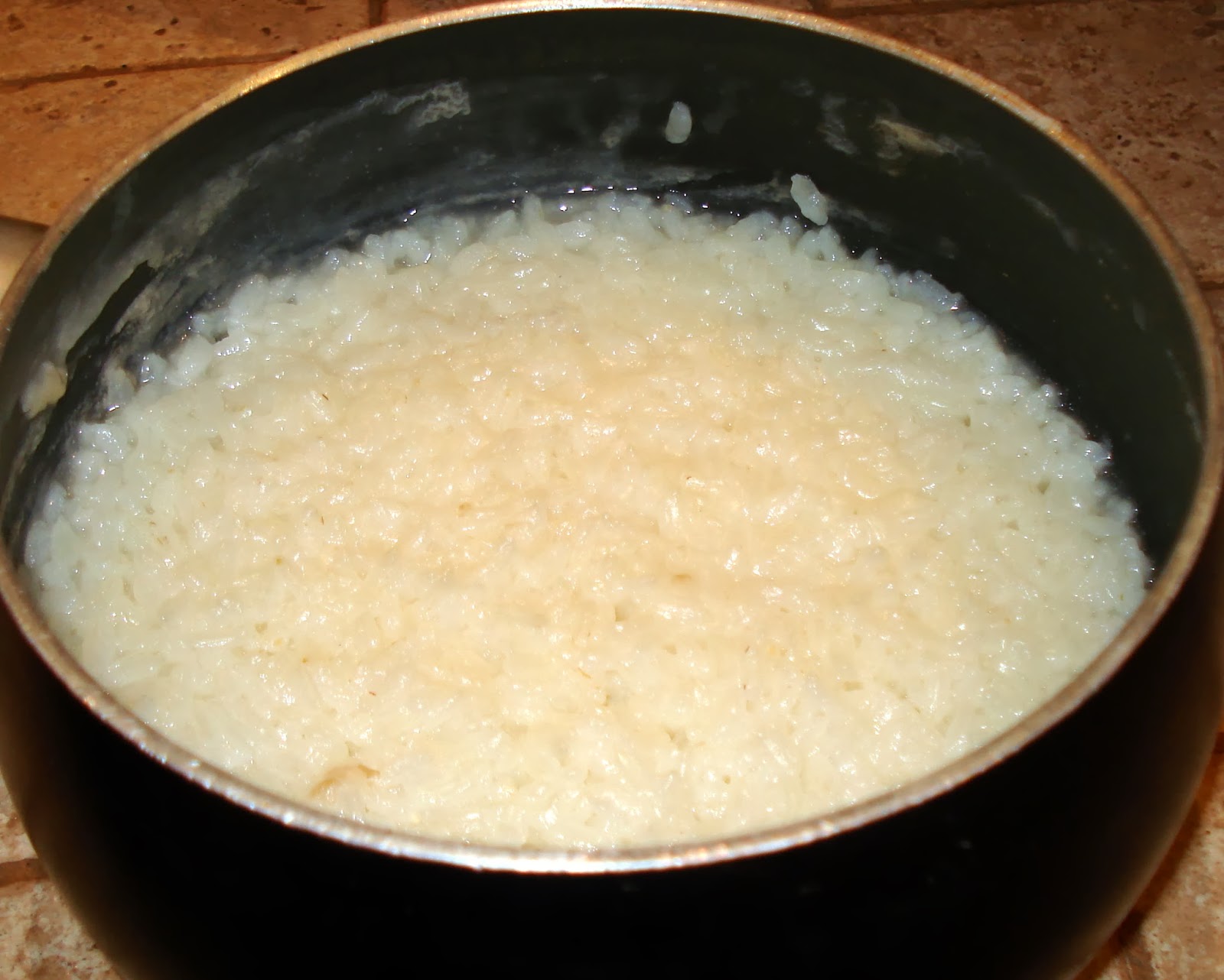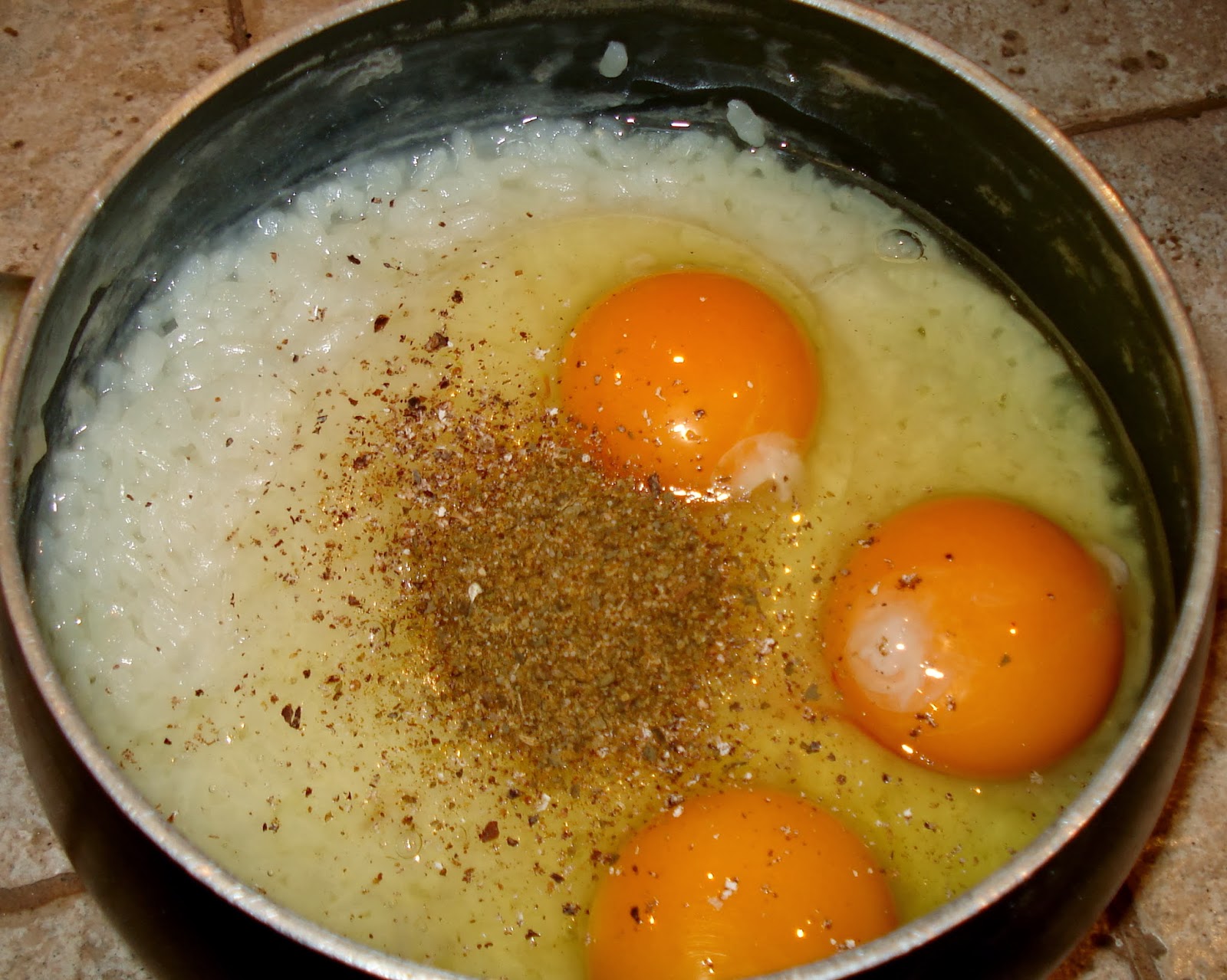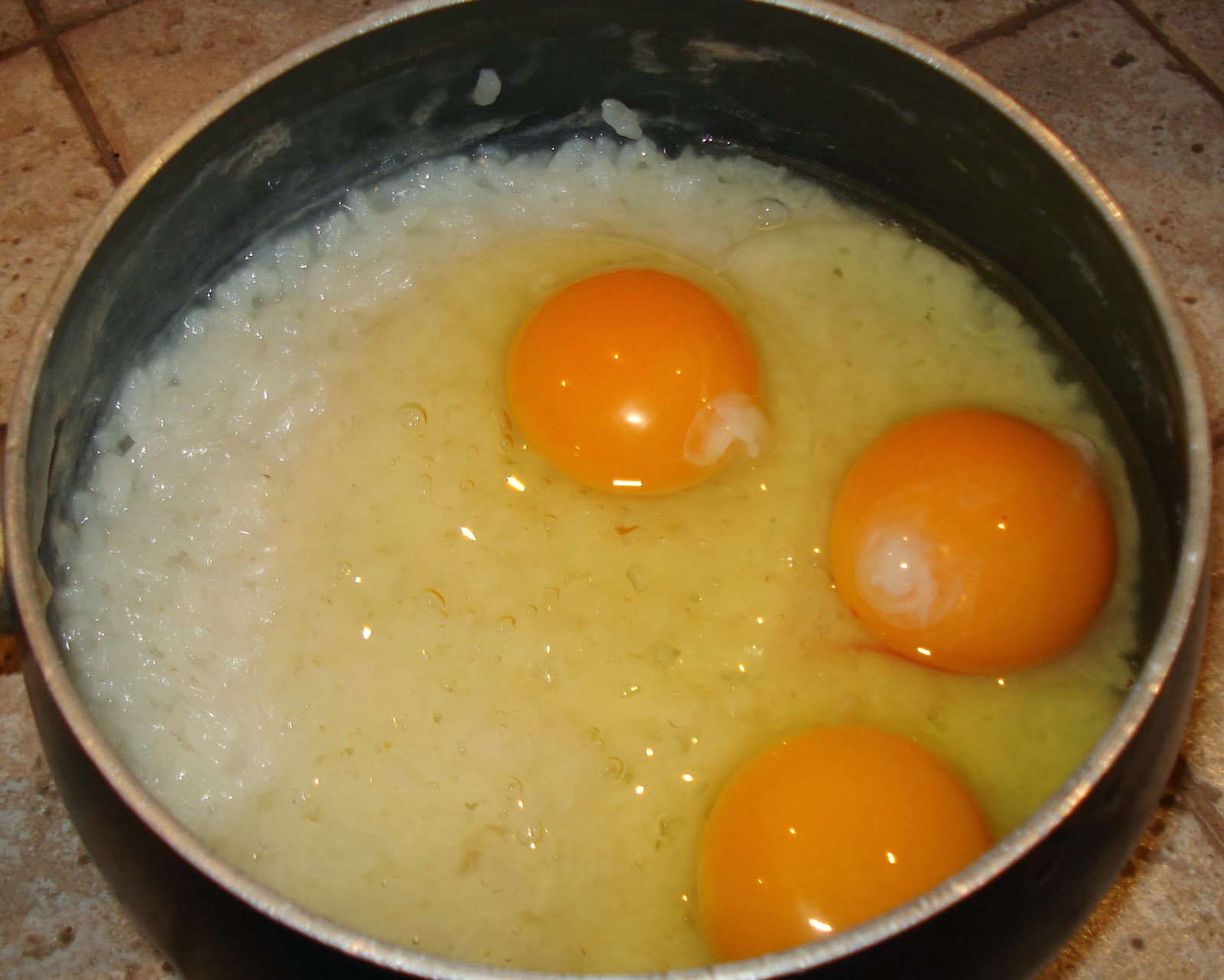 2. Приготовить три куриных яйца, разбить их в сваренный и слегка охлажденный рис.