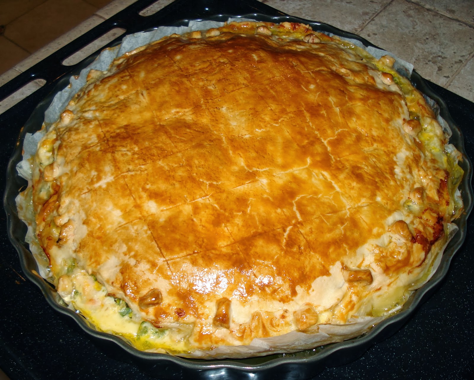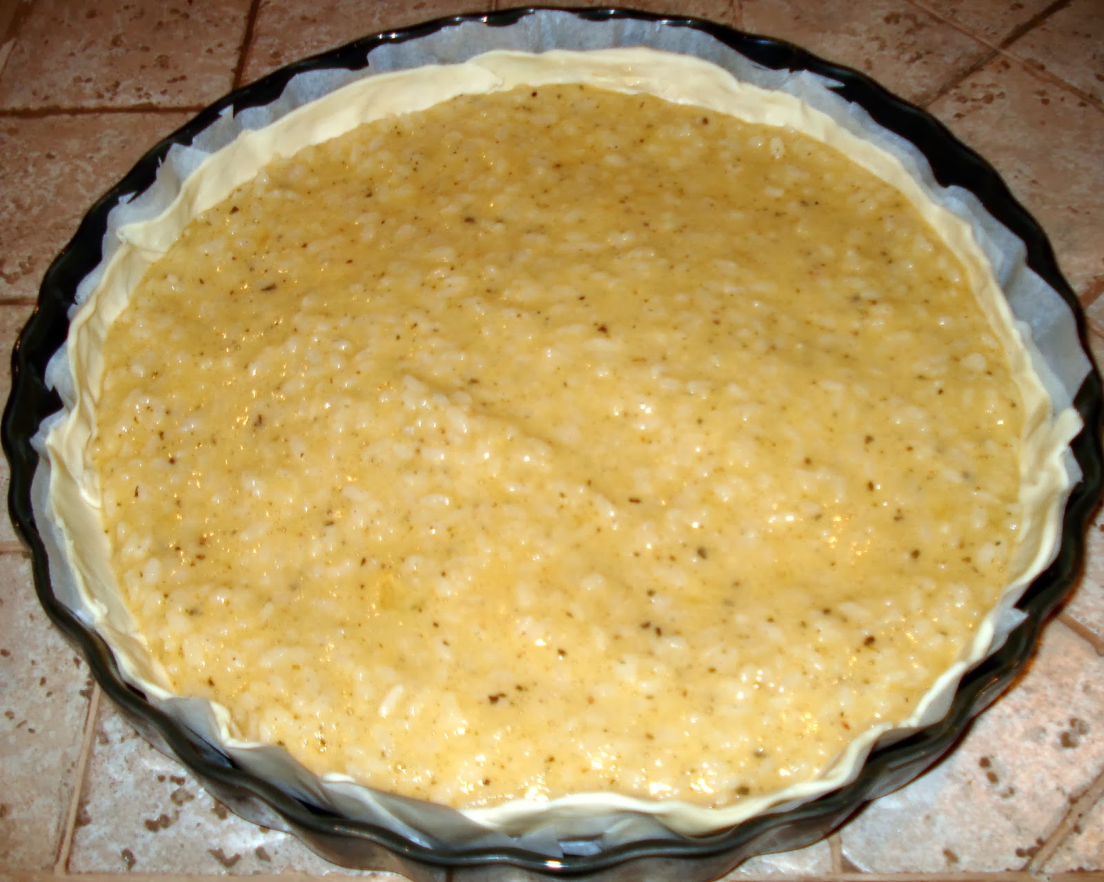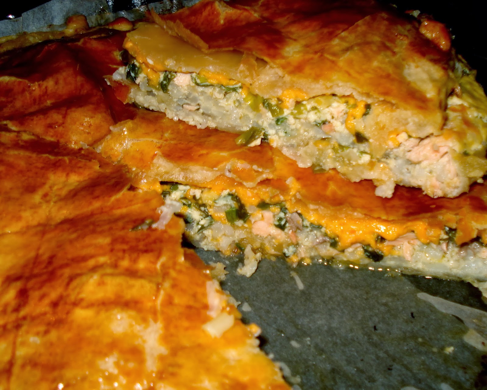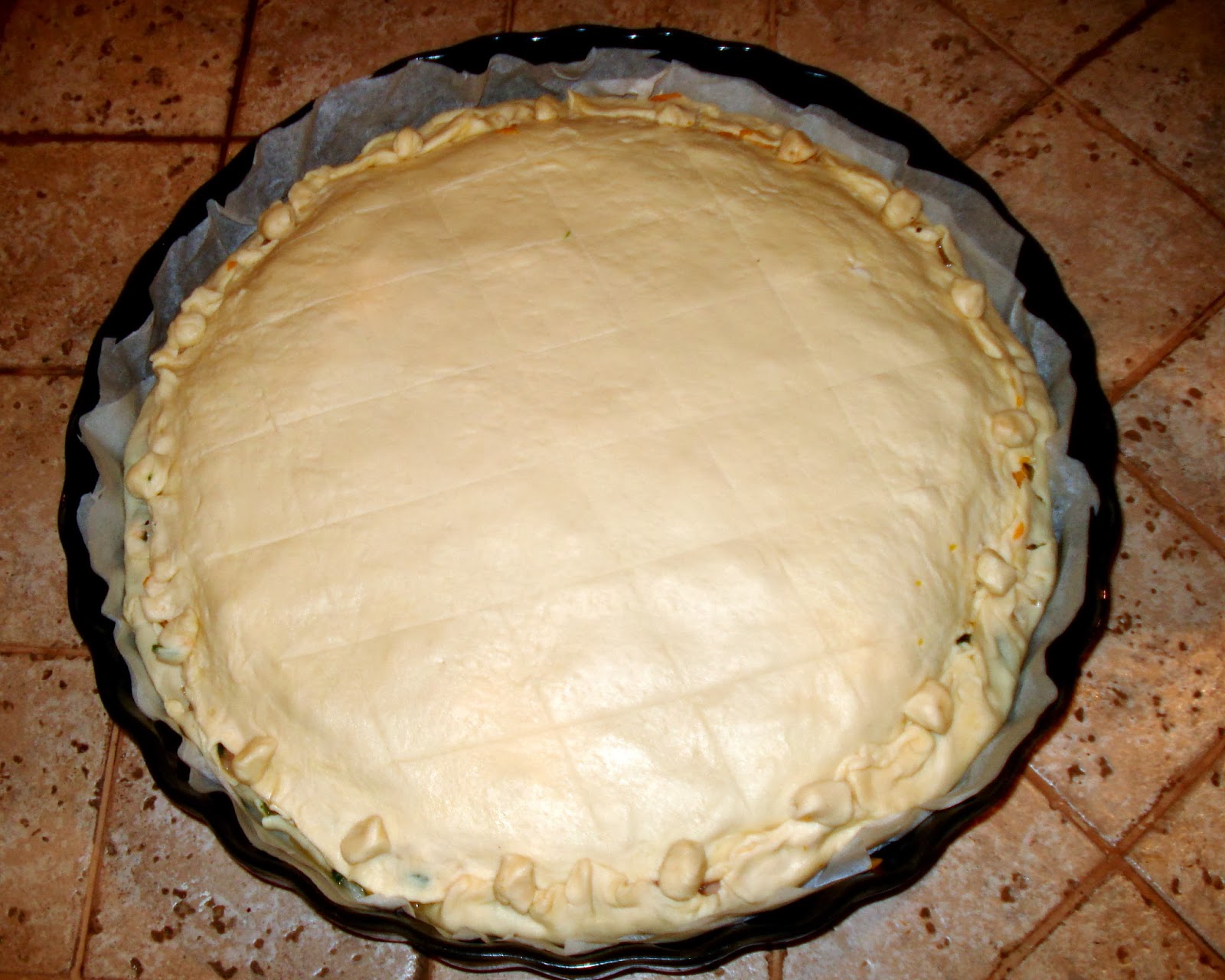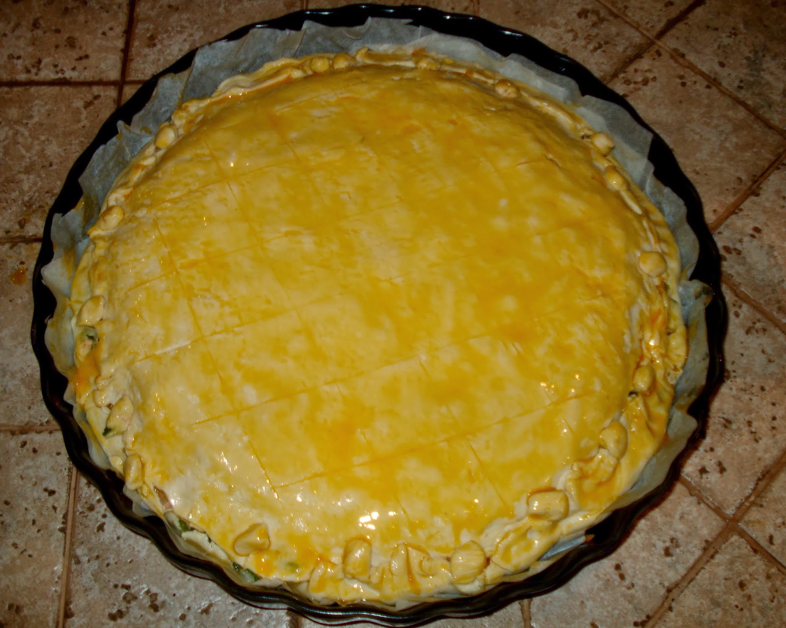 10. Запечатать пирог второй половиной порции слоеного теста. Помазать пирог желтком.