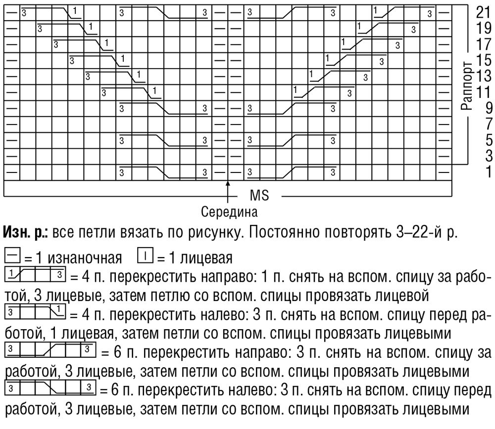 Вязать по схеме. На ней приведены только лицевые ряды, в изнаночных рядах все петли вязать по рисунку. Раппорт постоянно повторять. С 1-го по 22-й ряд выполнить 1 раз, затем с 3-го по 22-й ряд постоянно повторять.
