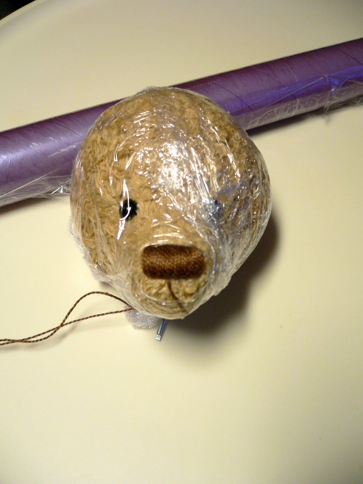 2. Заворачиваем голову медвежонка в пищевую пленку, для того чтобы жидкий воск не попал на ворс. Делаем в пленке небольшое отверстие для носика. Если вы уверенны в том что сможете провести всю процедуру максимально аккуратно, можно этот пункт пропустить.