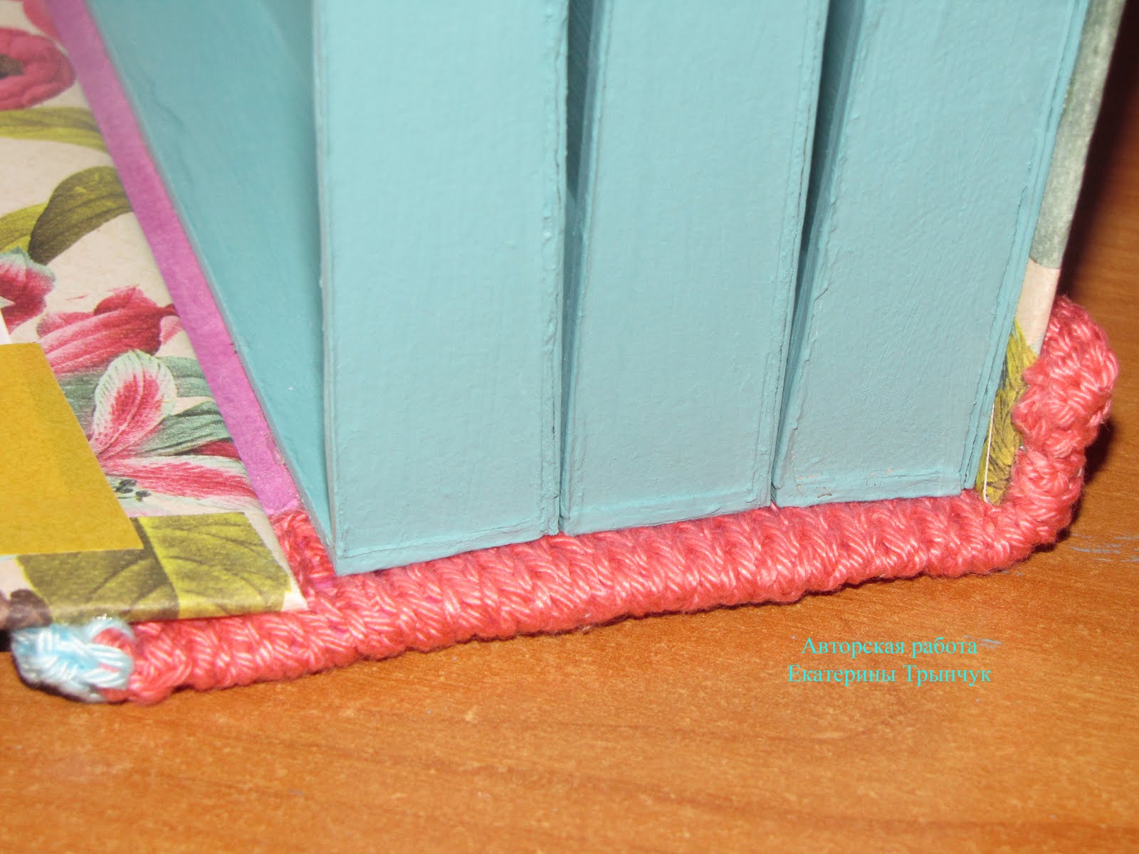 6 этап.Изготовление корешка.Складываем все коробочки вместе и обложки,измеряем высоту нашей шкатулки.Это и будет ширина корешка плюс 3 см.Длина корешка будет 19 см.Вяжем корешок спицами,по желанию вывязывая рисунок или имя.Боковинки оформляем крючком.