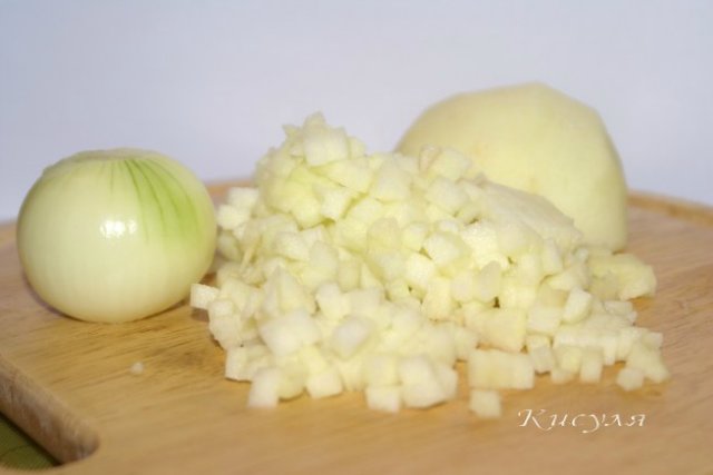 - Репчатый лук порежьте небольшими кубиками. Замаринуйте (см. хитрость №4).