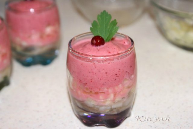 Лёгкая, пикантная закуска, прекрасная альтернатива "под шубой"! Можно приготовить заранее, перед подачей украсить. Если у вас останется немного брусничного мусса, то от него никто не откажется. Он сам по себе очень вкусный! Вместо брусники можно использовать клюкву, уменьшив её количество вдвое, исключив лимонный сок и добавив сахара.